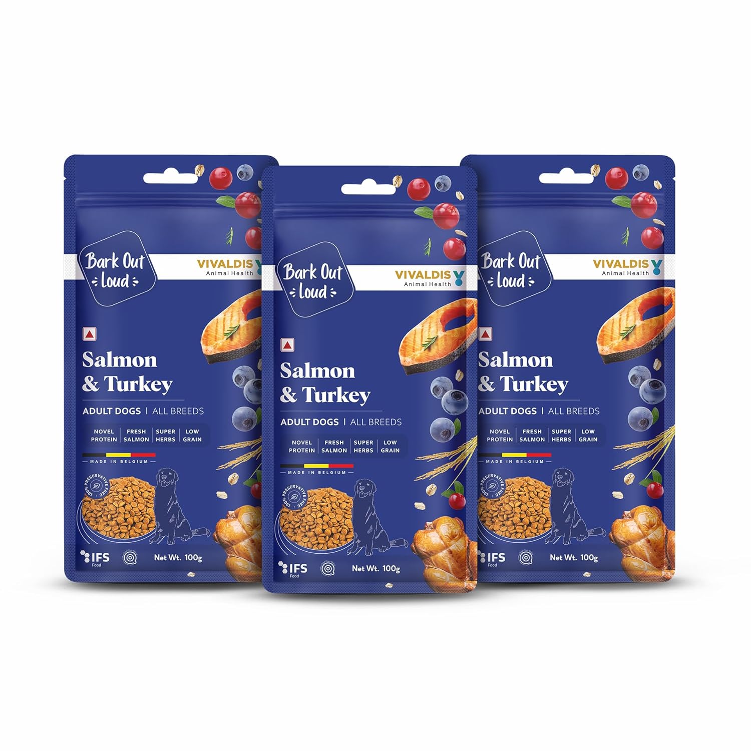 Bark Out Loud Adult Dry Dog Food for All Breeds – Salmon and Turkey Formula, Pet Nutrition, Rich in Novel Protein and Prebiotics, Fresh Salmon, Super Herbs Low Grain, 300 gm (100 gm x 3)