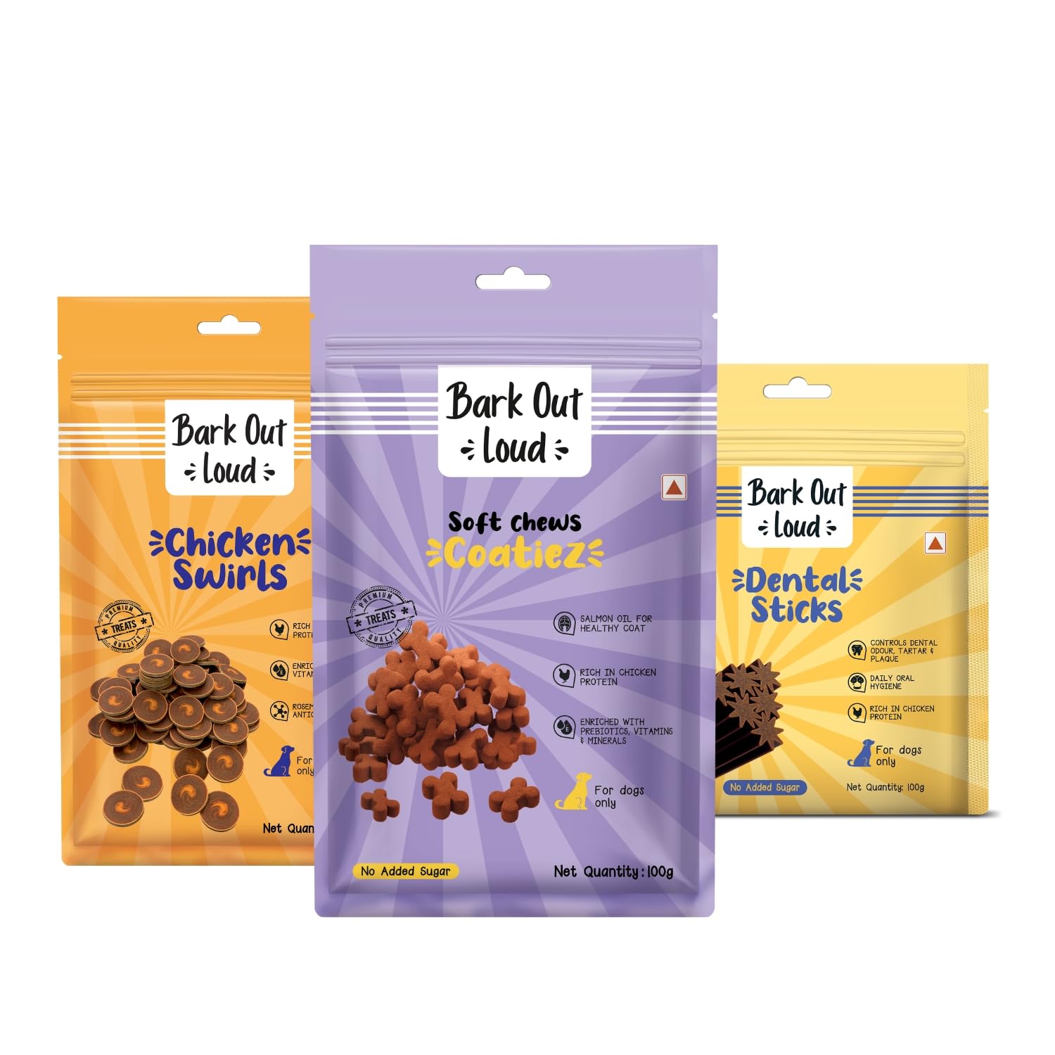 BARK OUT LOUD By Vivaldis – Dog Treats Combo Of Dental Sticks, Coatiez Soft Chews And Chicken Swirls – Sugar-Free Pet Food, Suitable For All Life Stages Of Dogs, 310 Gram