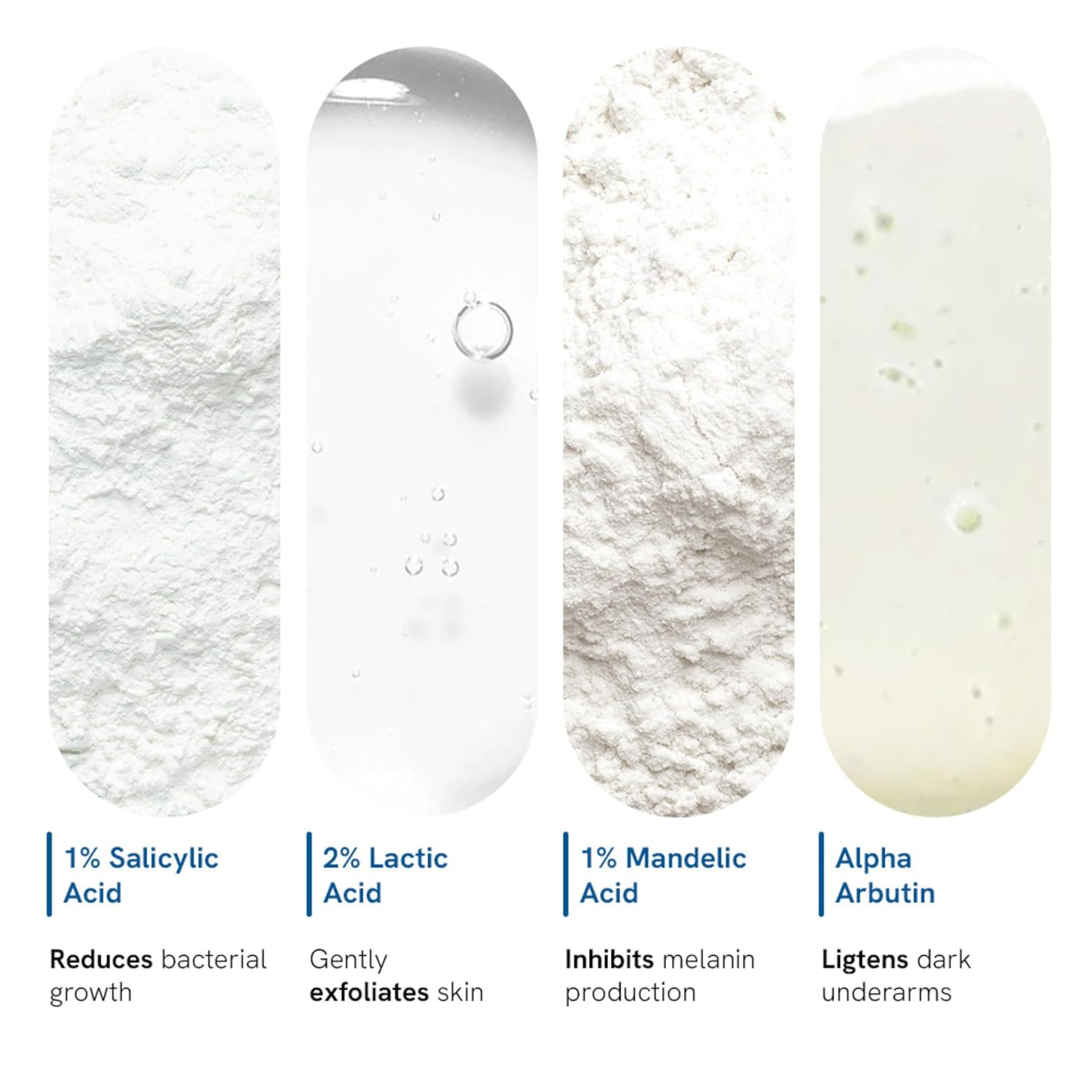 REDUCES PIGMENTATION & IMPROVES TEXTURE: Enhances Skin texture & reduces mild pigmnetation. A blend of 2% Lactic Acid, 1% Salicylic Acid, 1% Mandelic Acid, and Alpha Arbutin gently exfoliates dead skin cells, accelerates cell renewal, boosts collagen production, and reduces melanin synthesis, resulting in smoother, more even-toned, and radiant underarms.