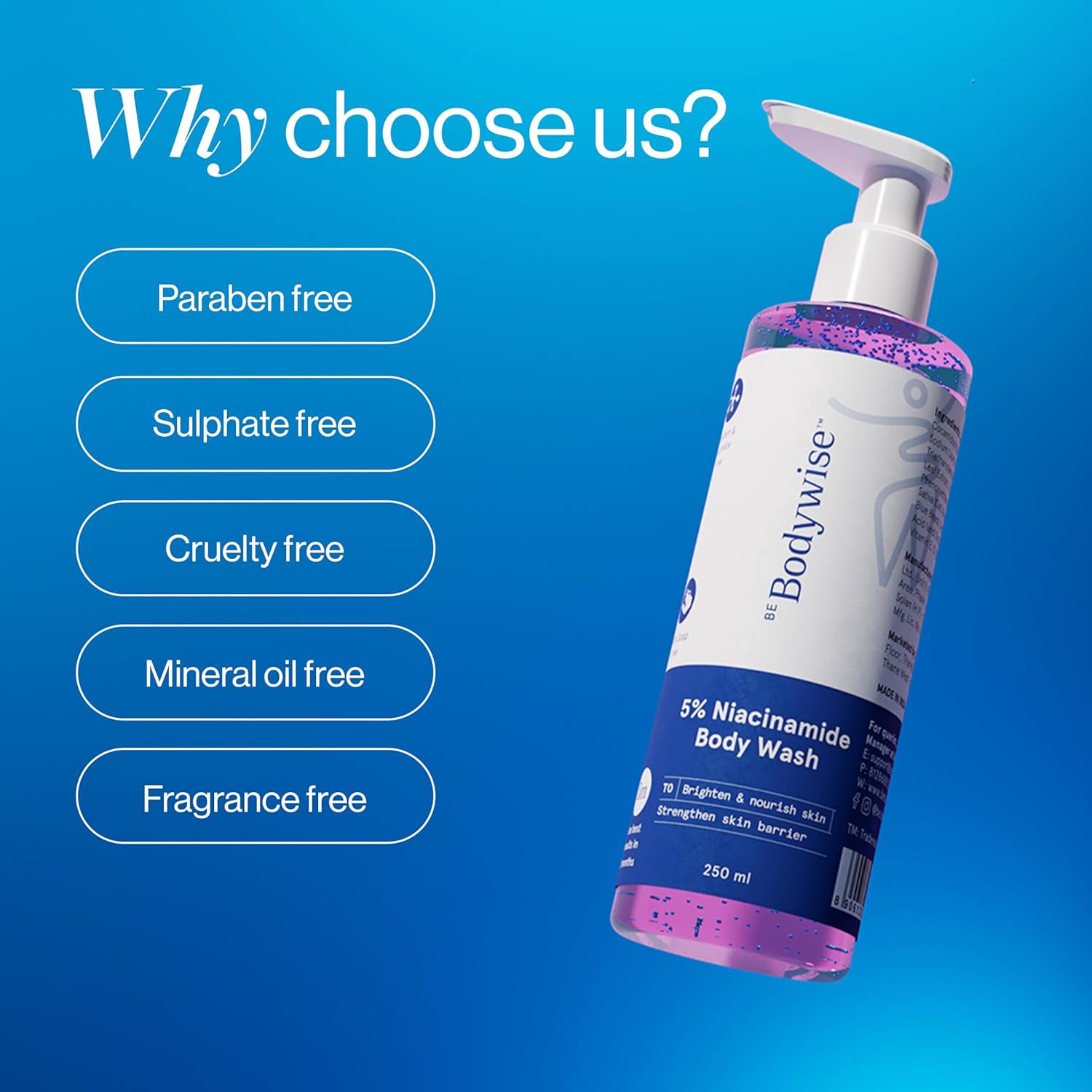 SAFE & EFFECTIVE:- Developed by dermatologists, the 5% Niacinamide body wash is made with clean & effective ingredients which are free from harmful chemicals compound like paraben, sulfate & silicone. Our products are not tested on animals ensuring an overall safe testing method.