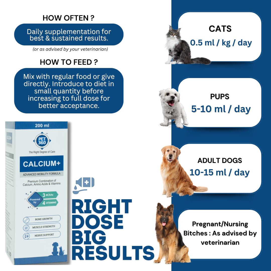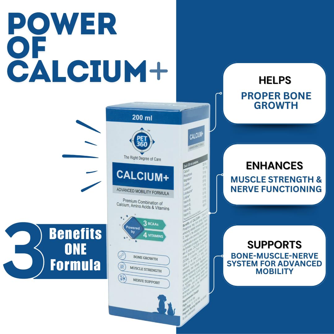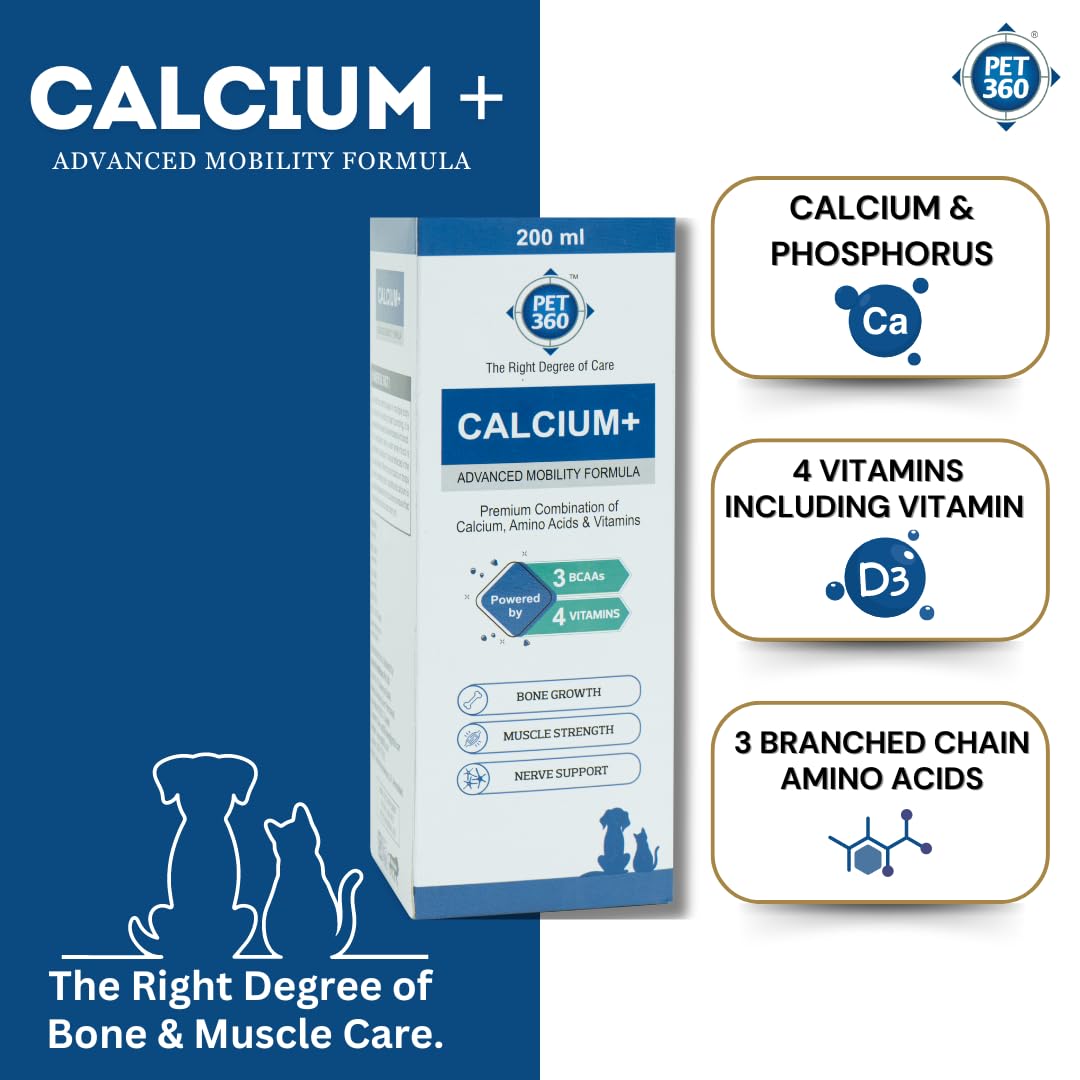 ESSENTIAL DIETARY COMPONENTS: PET360 CALCIUM+ pet syrup is specially designed to support strong and healthy bones in pets. The combination of calcium, phosphorus, three branched chain amino acids (BCAAs) & four vitamins will aid your pet with enhanced vitality to the interconnected Bone-Muscle-Nerve system.