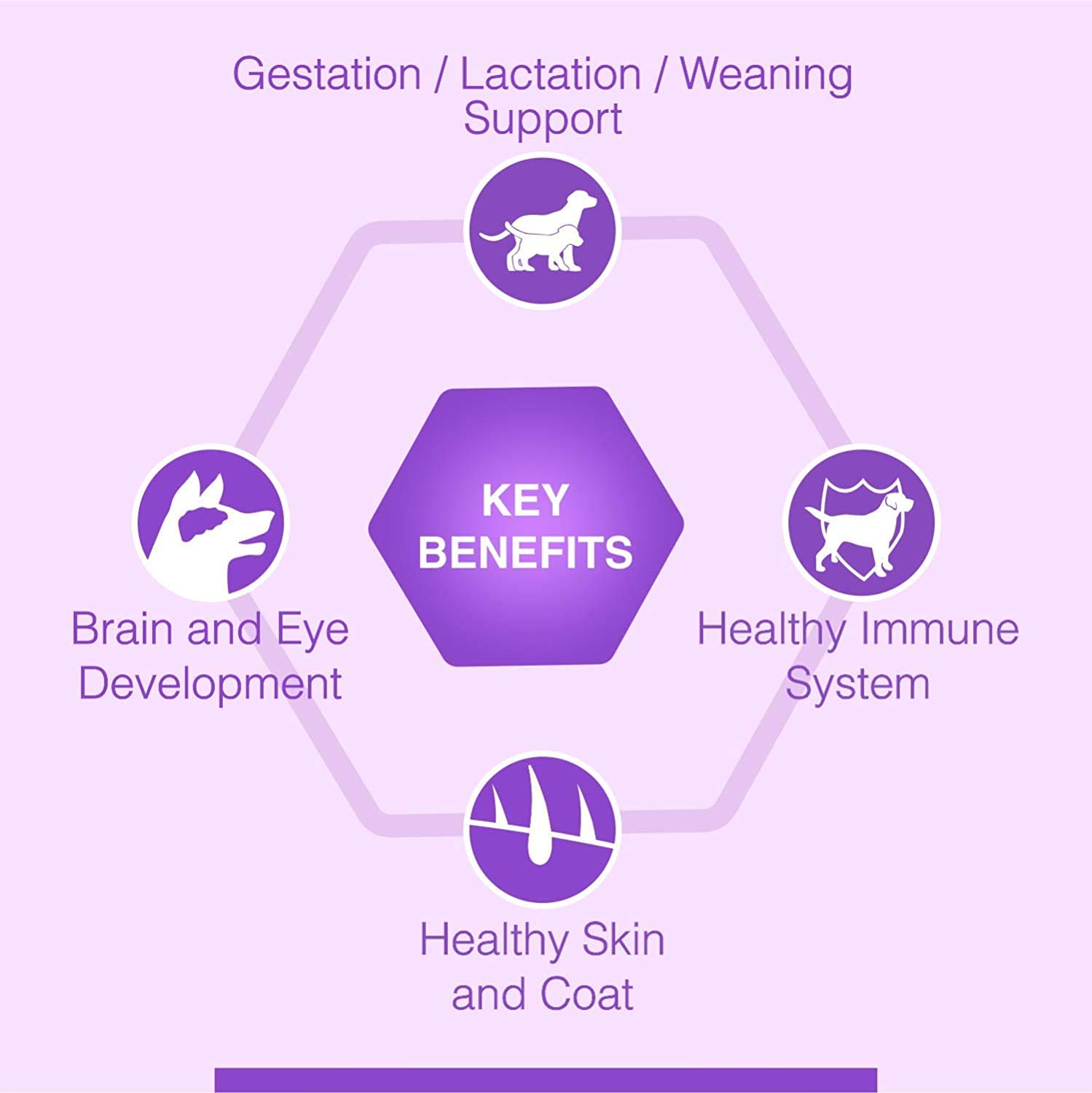 Nutritional profile specifically adapted for the mother dog’s high energy needs at the end of gestation, during lactation and weaning phase.