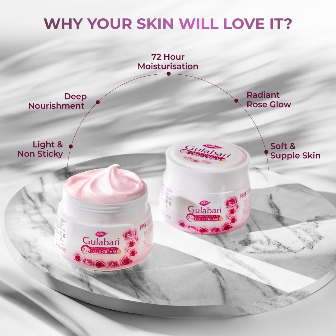 Dabur Gulabari Moisturizing Cold Cream 100gm + Lip Balm 8gm (Free) | With Goodness of Natural Rose Oil & Vitamin E | Intense Hydration and Deep Moisturization | For Smooth & Soft skin | All Skin types