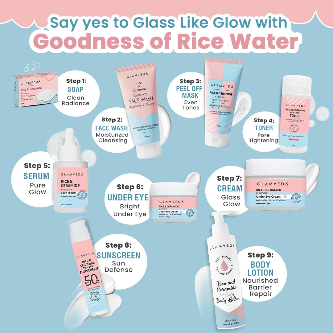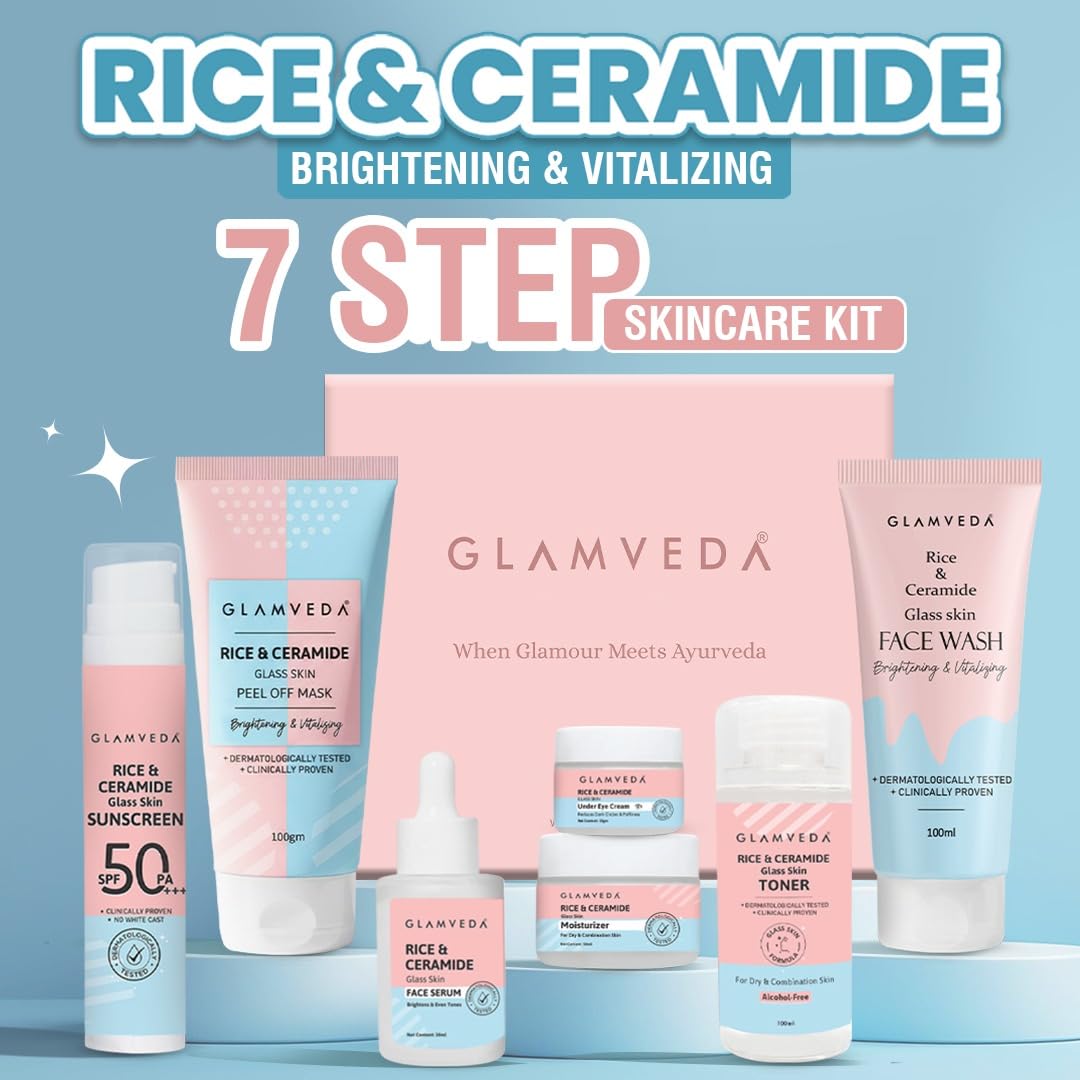 Glamveda Korean 7 Step Winter Skincare Kit for Women | Rice & Ceramide Routine | Gift Box | Skin Brightening, Anti-Ageing | Face Wash + Toner + Moisturizer + Serum + Mask + Sunscreen+ Under Eye Cream