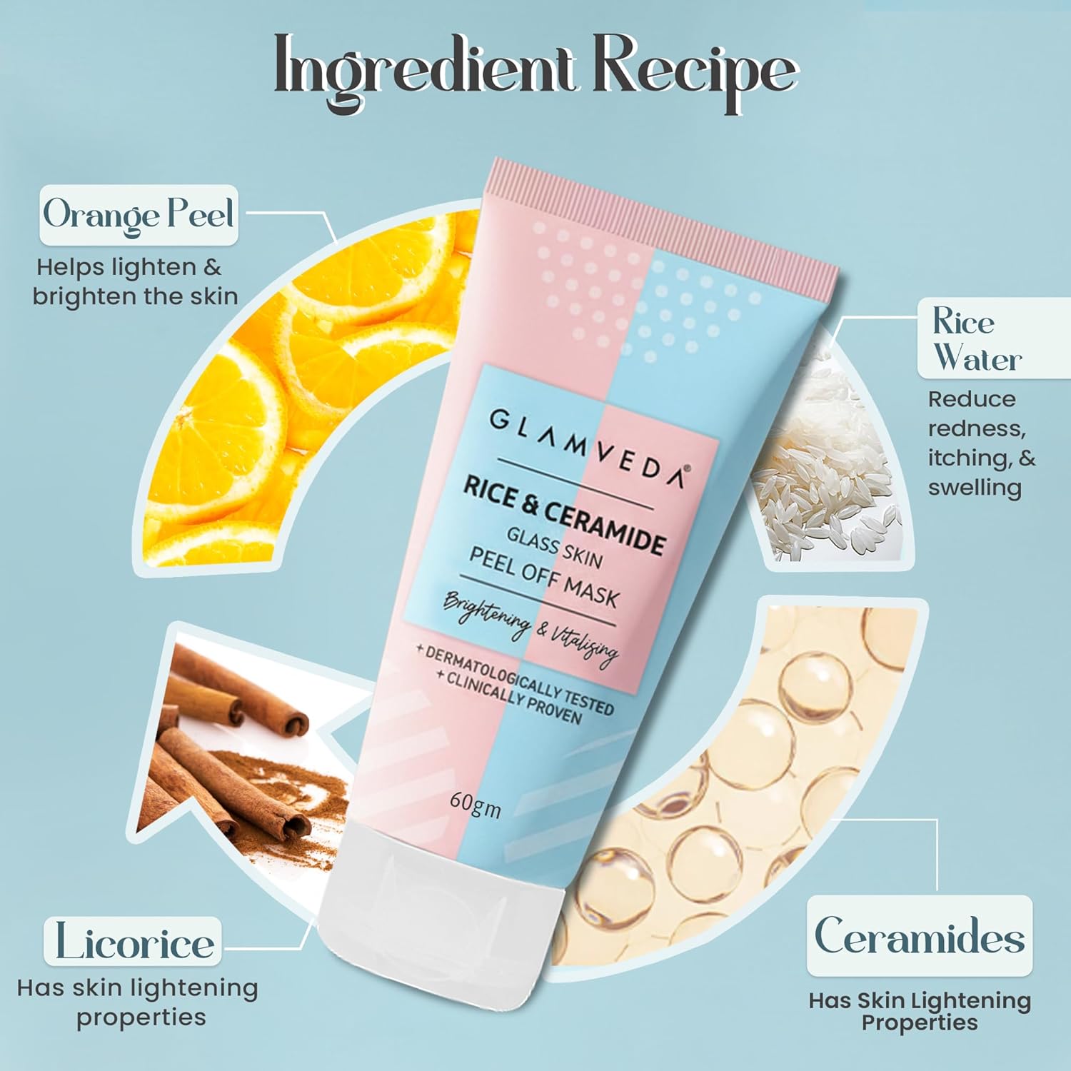 Glamveda Rice & Ceramide Korean Glass Skin Peel off Mask | Reduces Signs of Ageing | For Dry & Dull Skin Brightening & Even Tones Complexion | Peel off Face Mask for Men & Women | 60gm