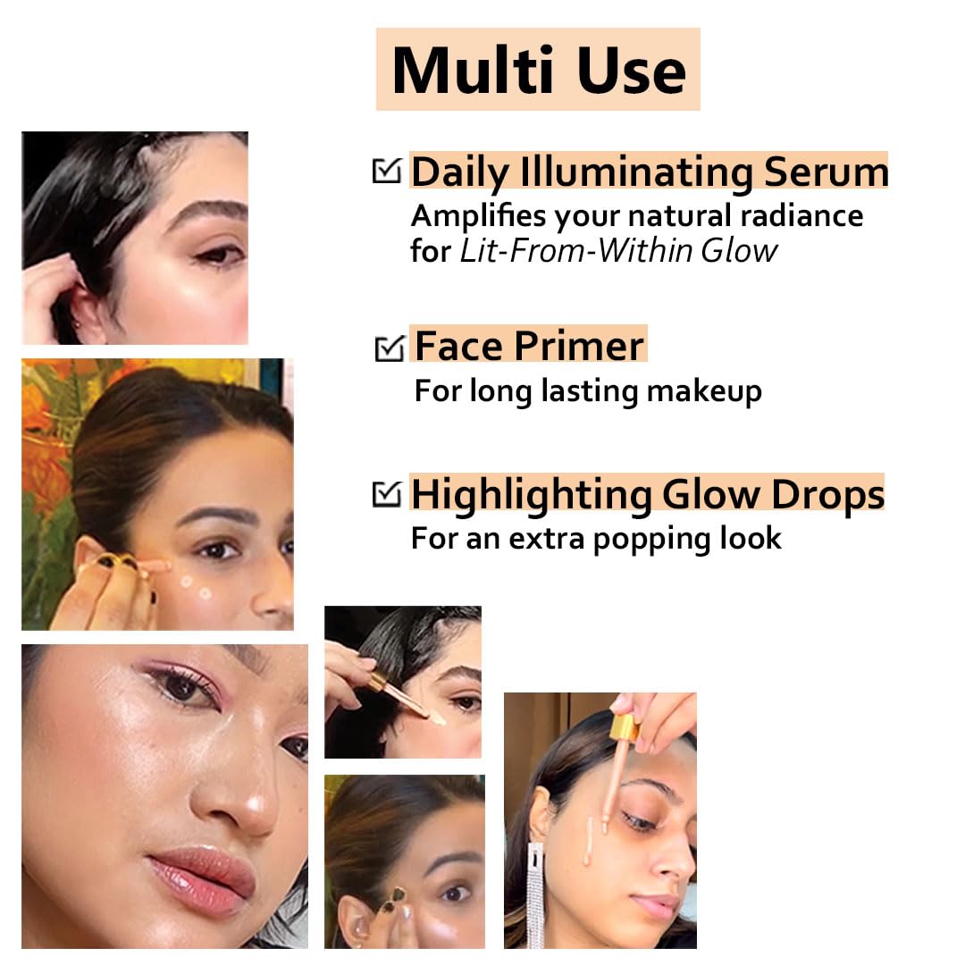 Daily Luminizing Serum – Apply alone or mix with your moisturizers / foundation, It blends beautifully for a soft, natural, dewy glow.Face Highlighter – Use few drops on the top of the cheekbones, the temples, bridge of the nose, collar bones for a popping look.Eyeshadow & Makeup primer – Use before the Makeup for long – lasting makeup while continuously hydrating & nourishing your skin.
