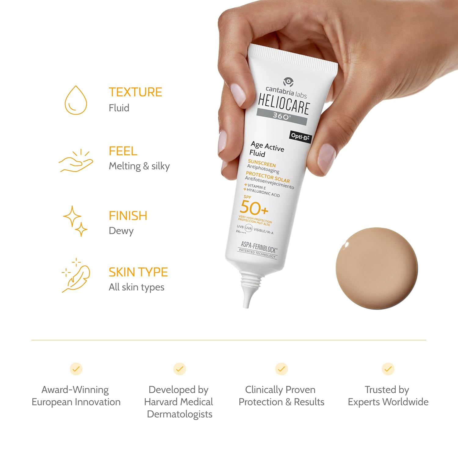Heliocare 360 Age Active Fluid SPF 50 Sunscreen | Anti-Aging & Blue Light Protection | Reduces Fine Lines & Wrinkles | Ultra-Light, Invisible Finish | Water & Sweat Resistant | 50ml