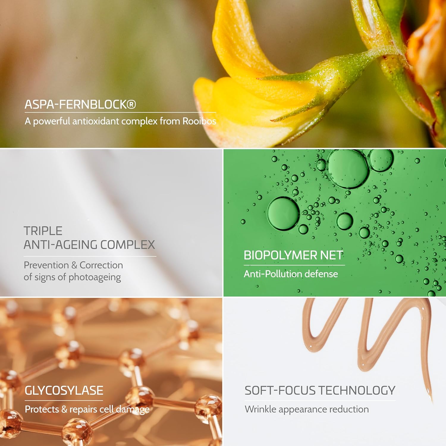 Triple Anti-Aging Complex: Formulated with hyaluronic acid, serine, and trehalose, this sunscreen effectively improves skin hydration, enhances firmness, and protects against oxidative damage, offering a comprehensive solution for ageing skin.
