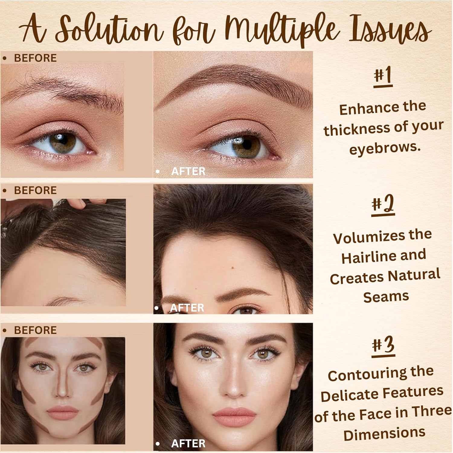 2in1 Hairline and Eyebrow Powder: Our 2in1 hairline and eyebrow powder offers versatile use with black and brown shades, ensuring seamless blending for both hairline and eyebrow touch-ups. Ideal for women seeking instant hair color touch up and eyebrow enhancement.