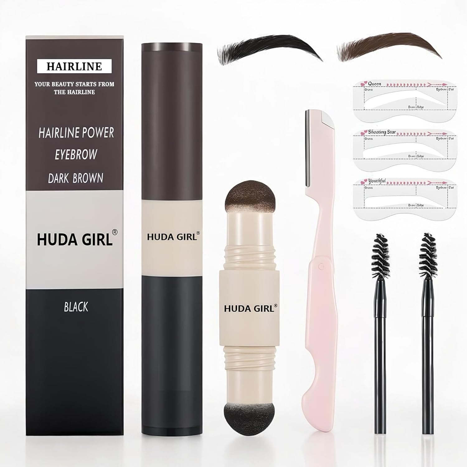 HUDA GIRL Dual Color 2in1 Hairline Powder & Eyebrow Filler for Women, Instant Hair Touch Up & Eyebrow Shaper Kit including Brow Stick Black & Brown with Razor, 2pcs Brush & 3 Brow Stencils