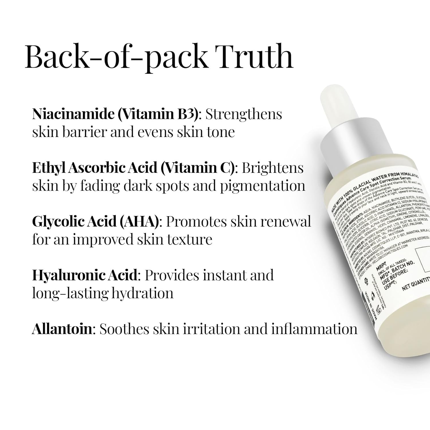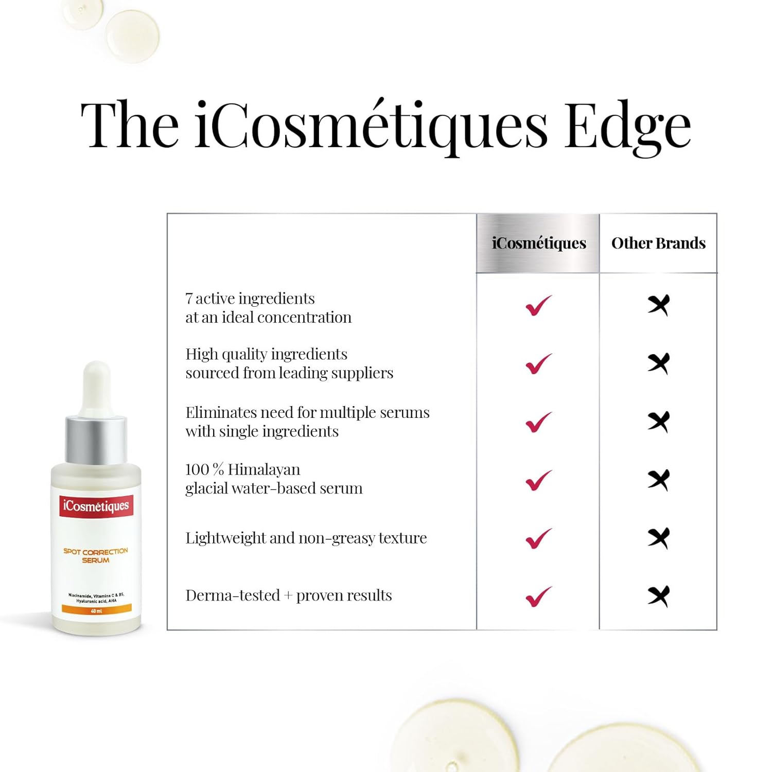 iCosmetiques Spot Correction Face Serum |For Bright, Even Skin Tone |Niacinamide, Hyaluronic Acid & Vitamin C |Infused with Himalayan Glacial Water |Unisex Advance Care Formula |40ml