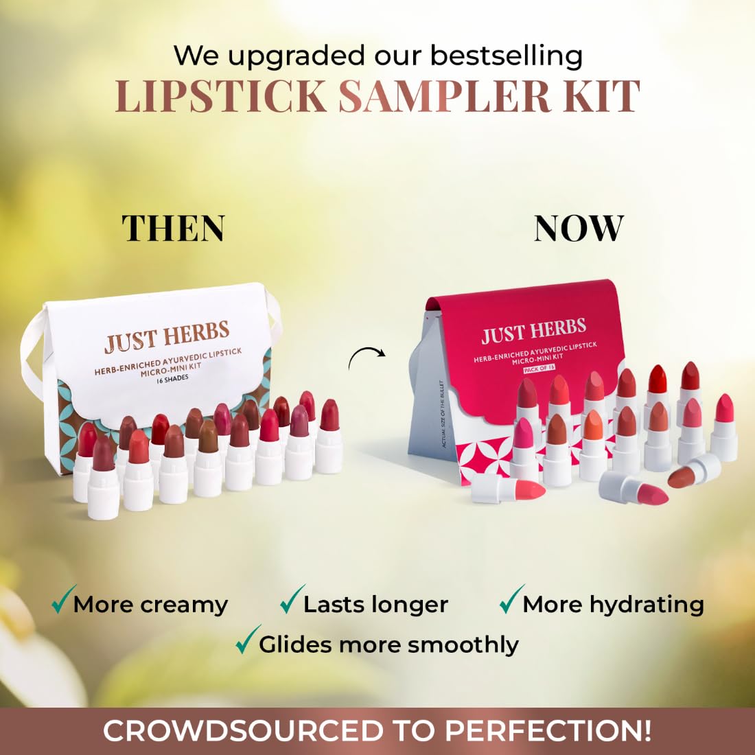 Ayurvedic Lipstick Kit: A curated pack of 16 herb-enriched matte lipsticks powered by Just Herbs’ Ayurvedic expertise.