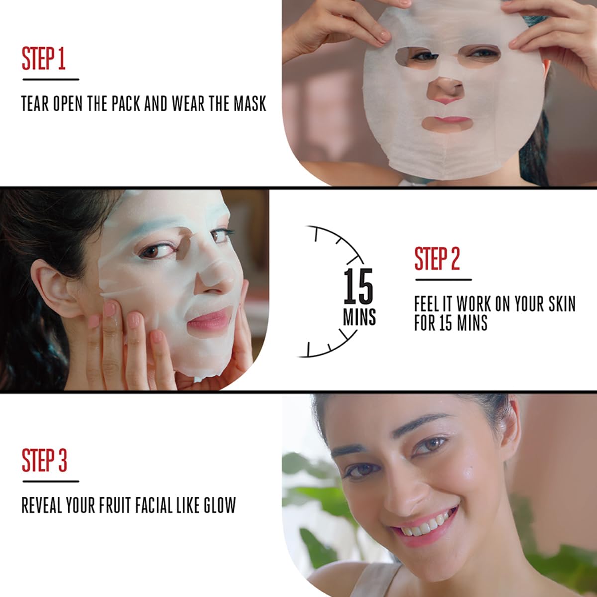 Lakme brings to you its first range of exciting Sheet Masks from blush and glow. If you are facing dull, dry, patchy skin that is yearning for some hydration that is infused with the goodness of your favourite fruits. If your skin wants to get a glow that feels like a fruit facial. Our sheet masks are meant to give you exactly that! Now soak your face in the goodness of 100% pure fruit extracts with the range of Lakme Blush & Glow Fruity-licious Sheet Masks. As you leave on this delightfully refreshing sheet mask, your face gets a burst of freshness and a gorgeous fruit-kissed glow. In just 15 minutes you feel rejuvenated like just out of a fruit facial. What’s more, the light, breathable fabric fits your face perfectly and smells oh! so delicious. It’s the ultimate way to pamper and nourish your skin and make it look fresh and feel soft and supple. Just tear, wear and get the glow! Try our collection of your favourite fruits – strawberry, watermelon, lemon, kiwi and pomegranate, now and get addicted to the fruity-licious experience! For best results, cleanse face first with Lakme Blush & Glow face wash. For all skin types. Dermatologically tested.