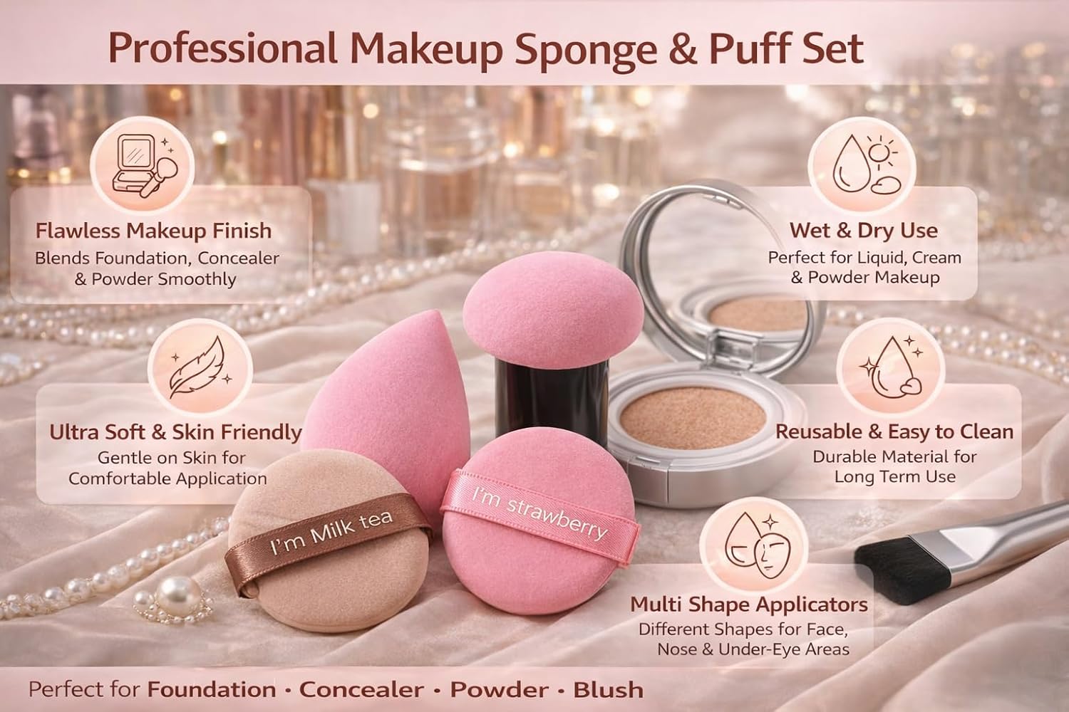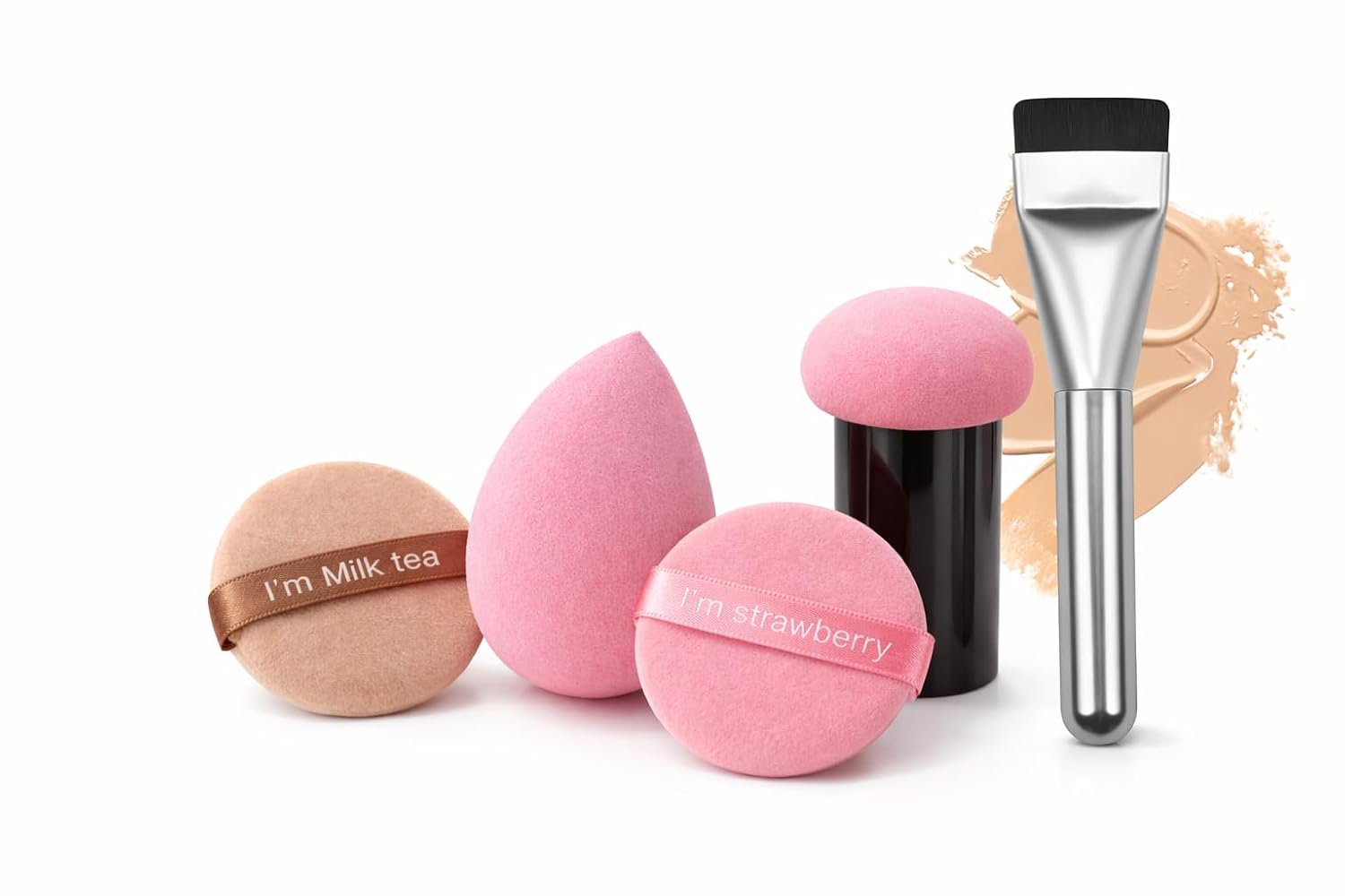 Complete Makeup Applicator Set :: Includes beauty blender sponge, mushroom head makeup sponge, powder puffs and foundation brush for full face makeup application.