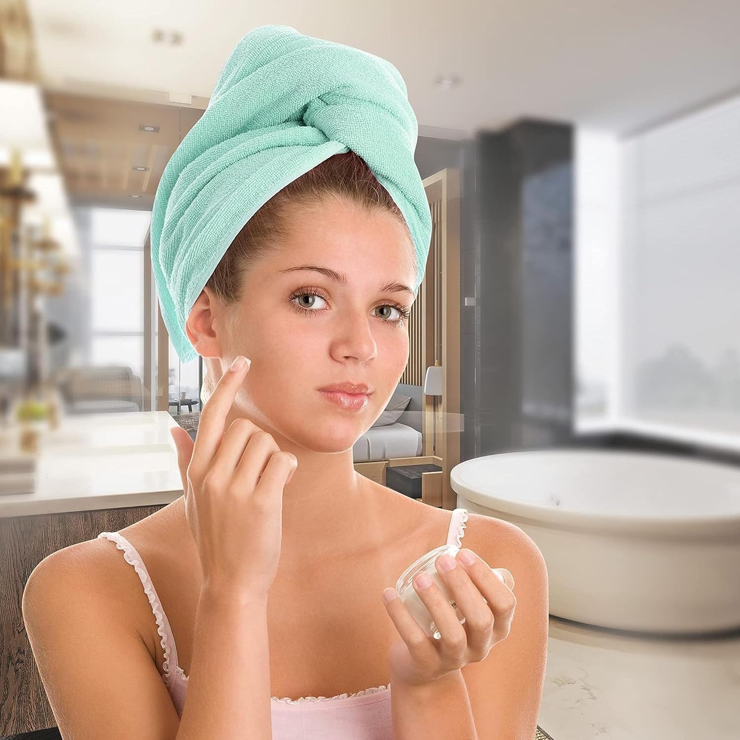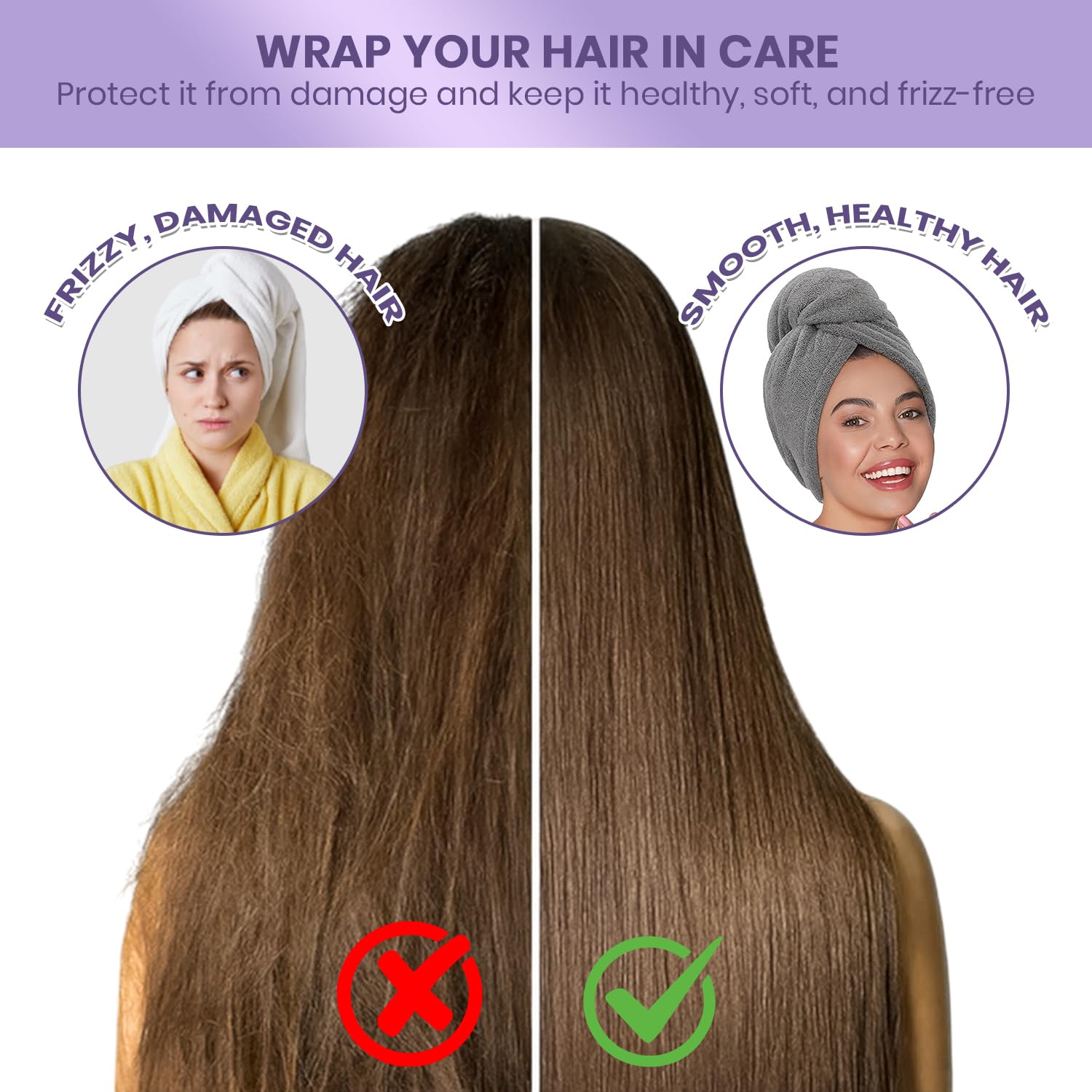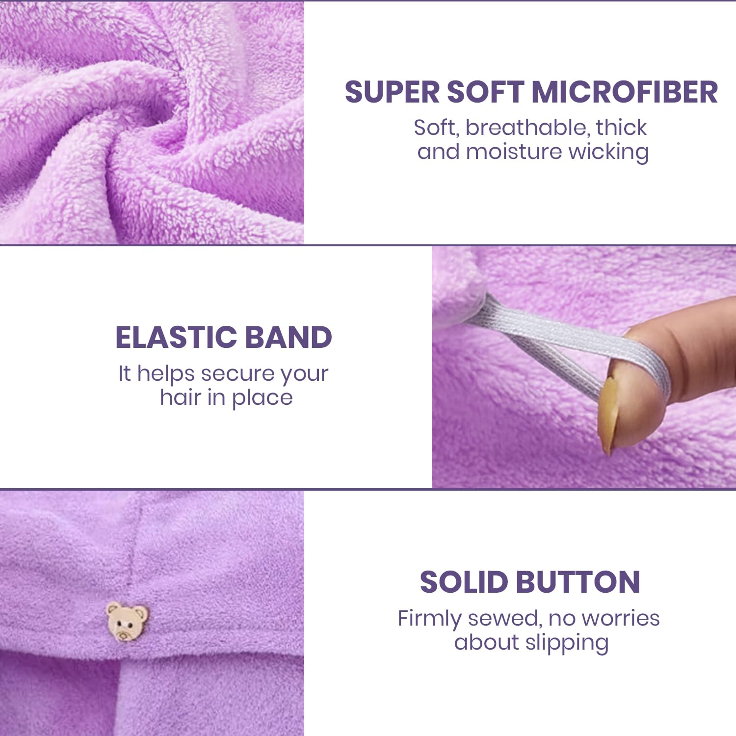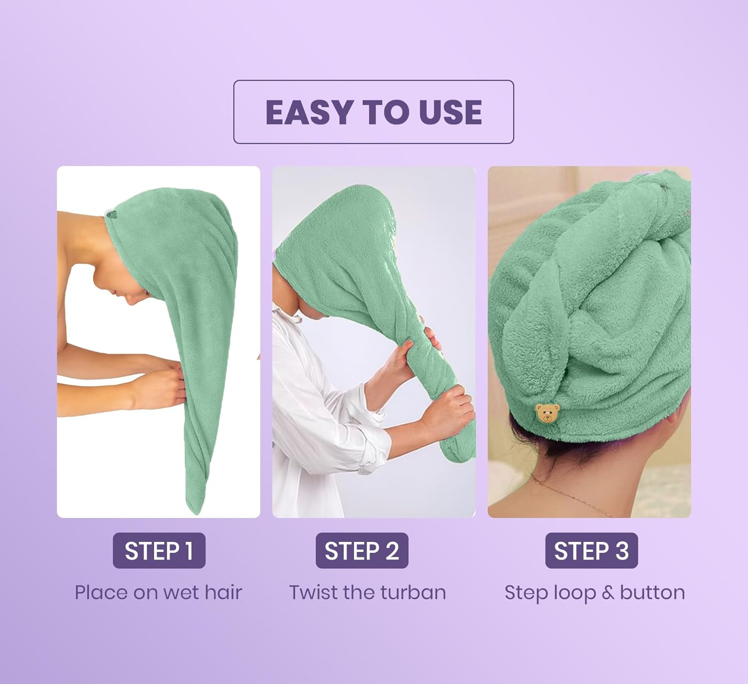 The unique non-slip twist and loop system makes it easy to firmly wrap the towel. The hair towel is attractive and so comfortable and easy to wear that using towels to wrap your hair becomes obsolete.