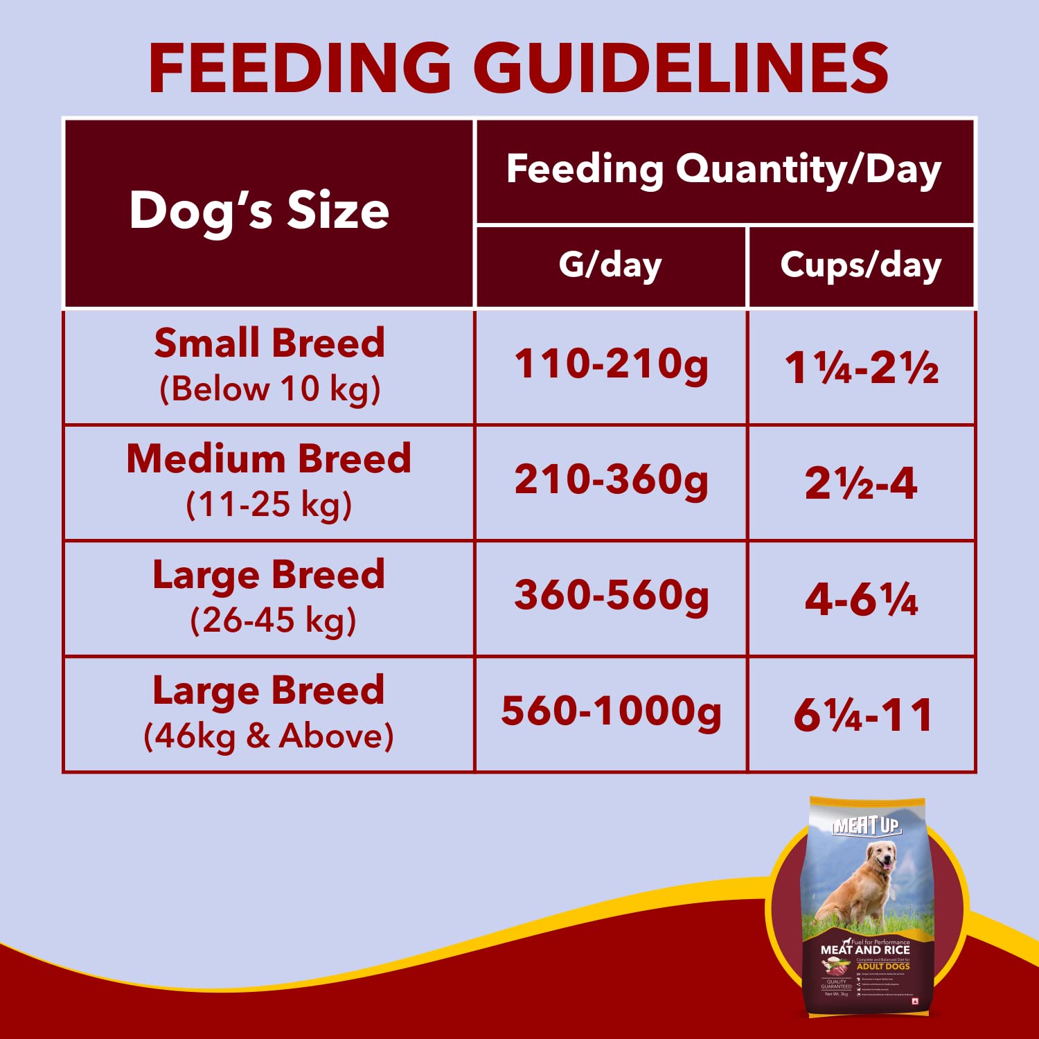 As per the given chart, start by introducing Meat Up food by 10% along with the current food. Gradually increase the proportion of Meat Up everyday and in a week you will be able to switch to 100% Meat Up food. Clean and fresh water should be available at all times