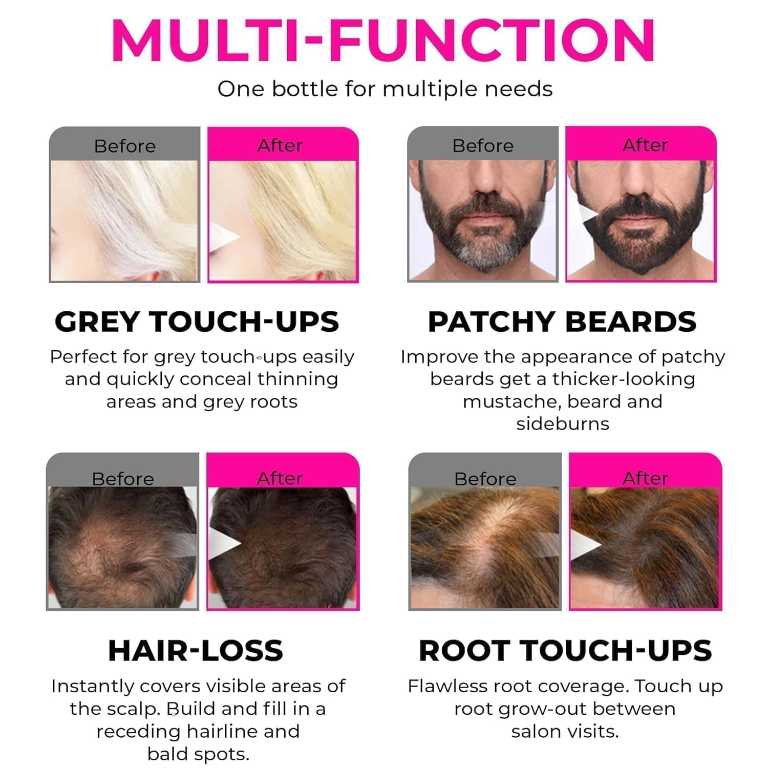 Stain Proof, Mess Free Hair & Beard Formula: Run your hands through your hair (or beard) without worry. worry-free hair and scalp-friendly formula goes on fast, locks on tight, and stays on your hair or beard – without clogging pores – so you get the voluminous hair, or that lusciously fluffy beard without stains or messy applications.