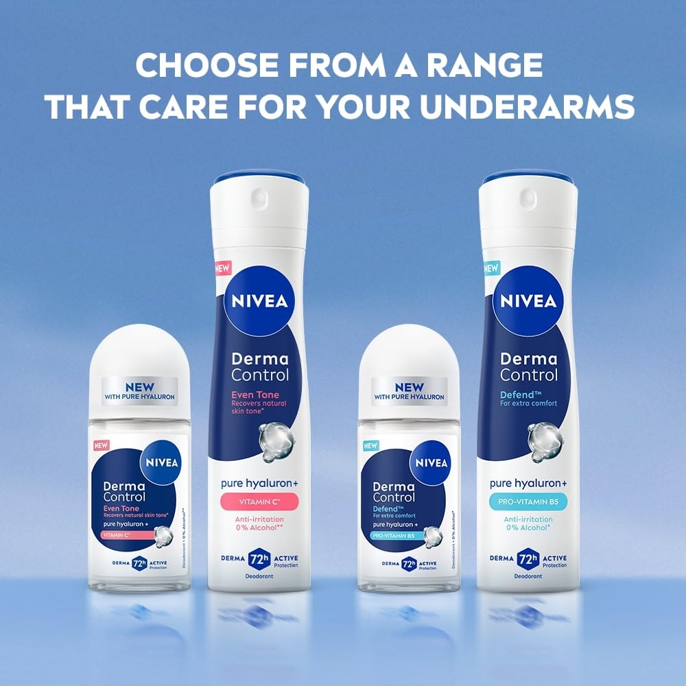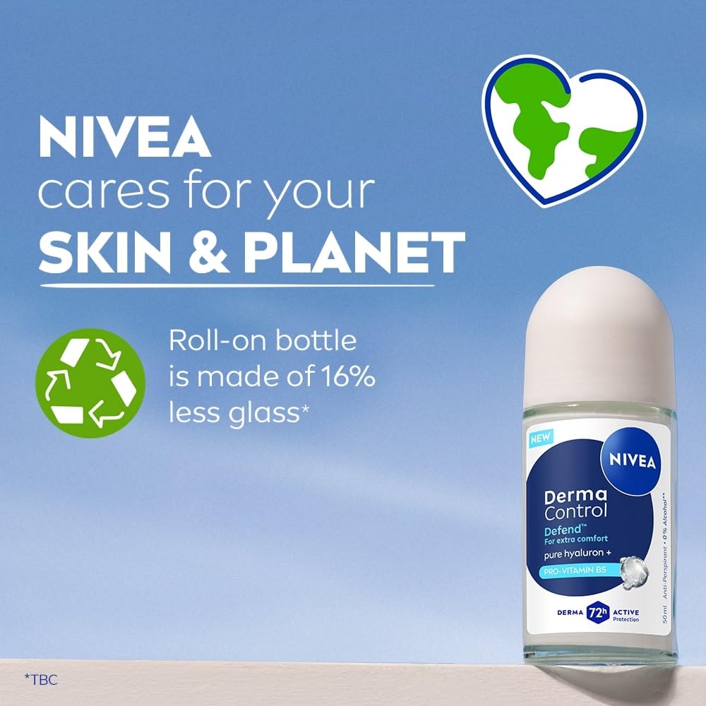 NIVEA Derma Control Defend Underarm Deo Roll-On for Women | Defends Against Irritation | 72H Derma Active Protection | With Pure Hyaluronic Acid & Pro-Vitamin B5 | 0% Alcohol | 50 ml