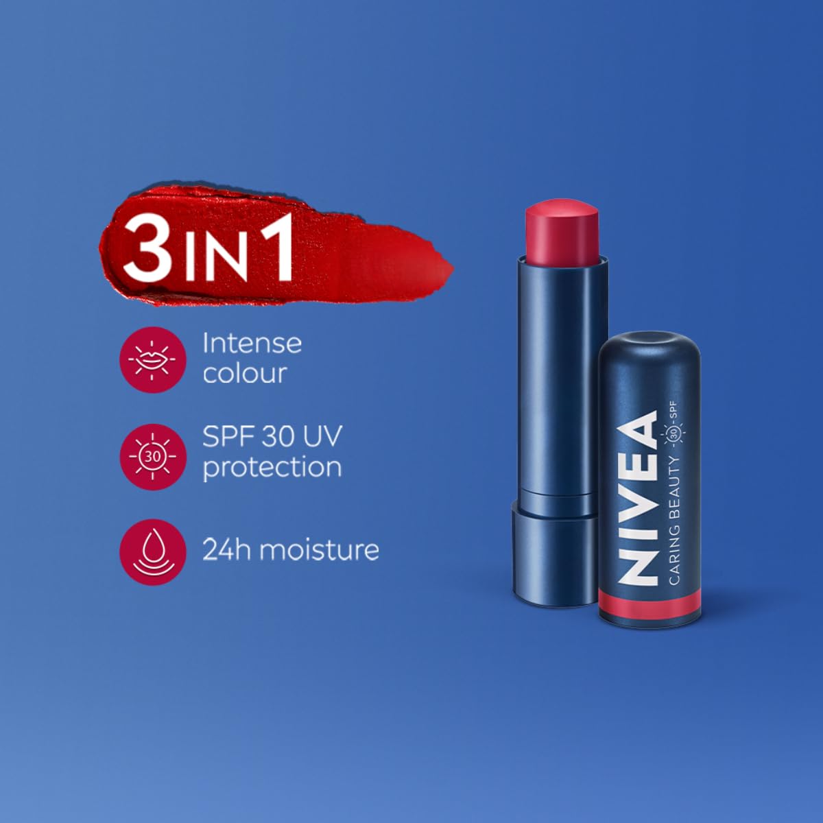 NIVEA Lip Caring Beauty Red combines intense color pigments with long-lasting hydration and helps protect against collagen loss with SPF 30 sun protection.