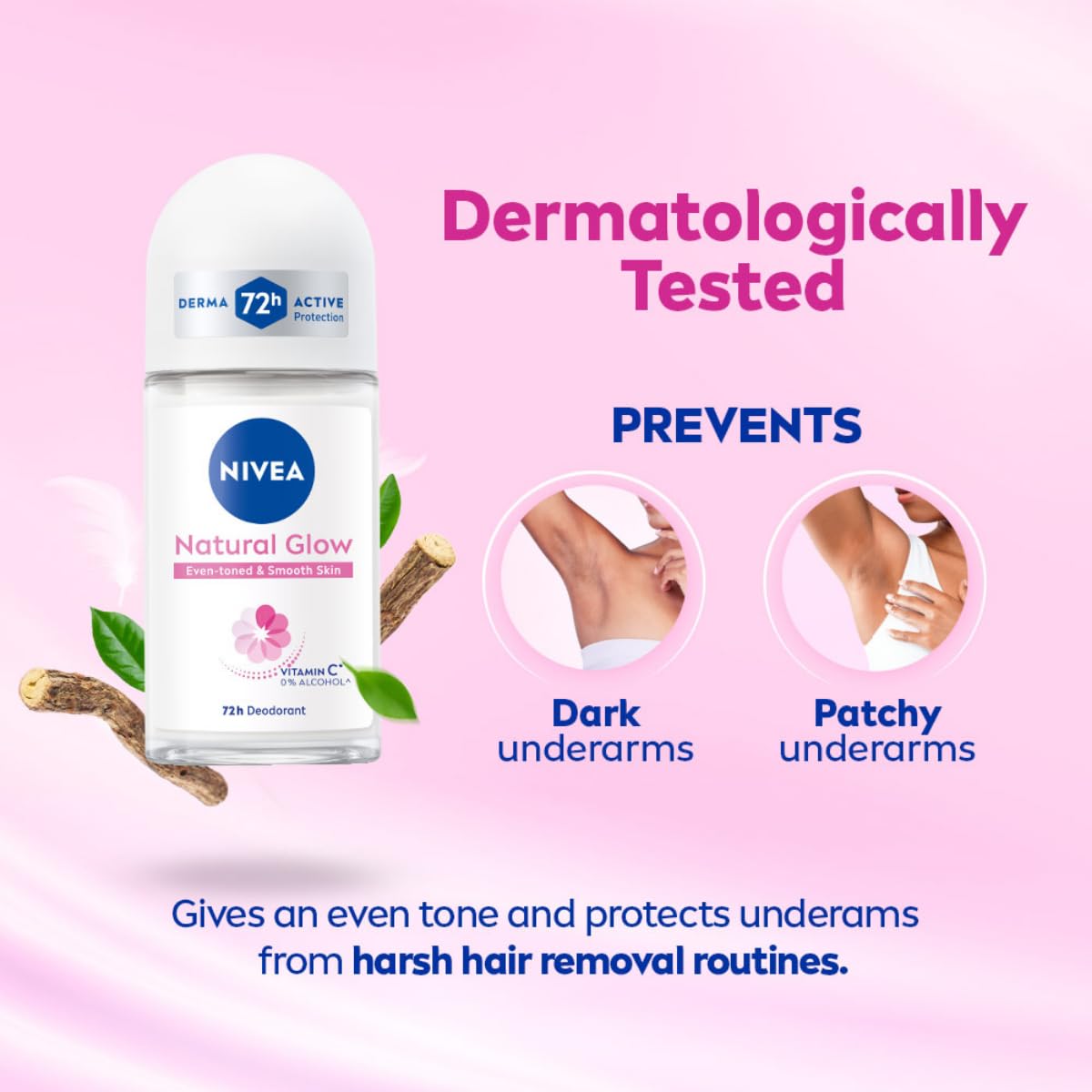 NIVEA Natural Glow Smooth Skin Deodorant Underarm Roll On For Women|Vitamin C,Vitamin E,Avocado Oil And Licorice Extract|72 H Even Toned,Smooth & Bright Underarms|0% Alcohol And Dermat Approved|50 Ml