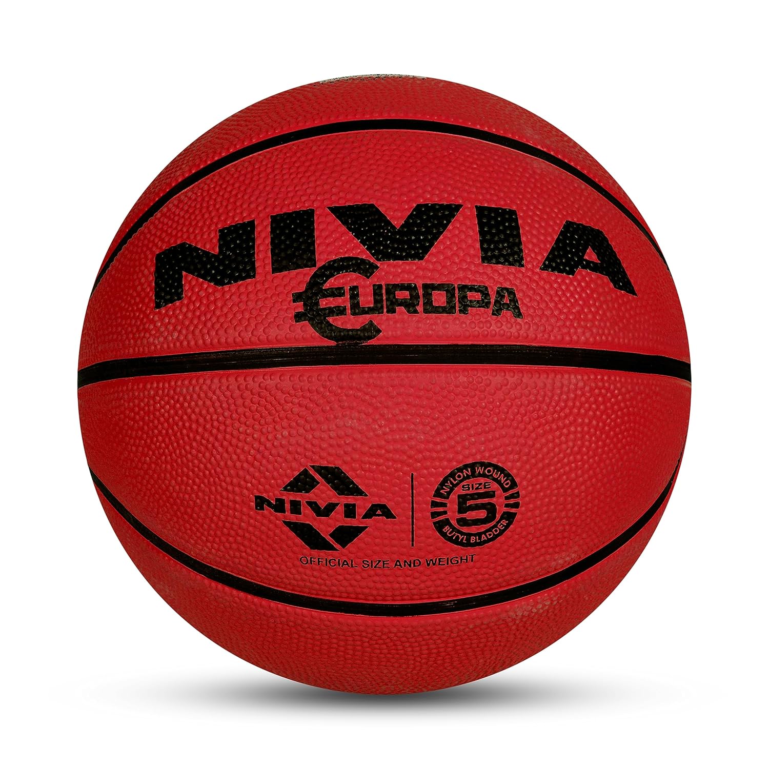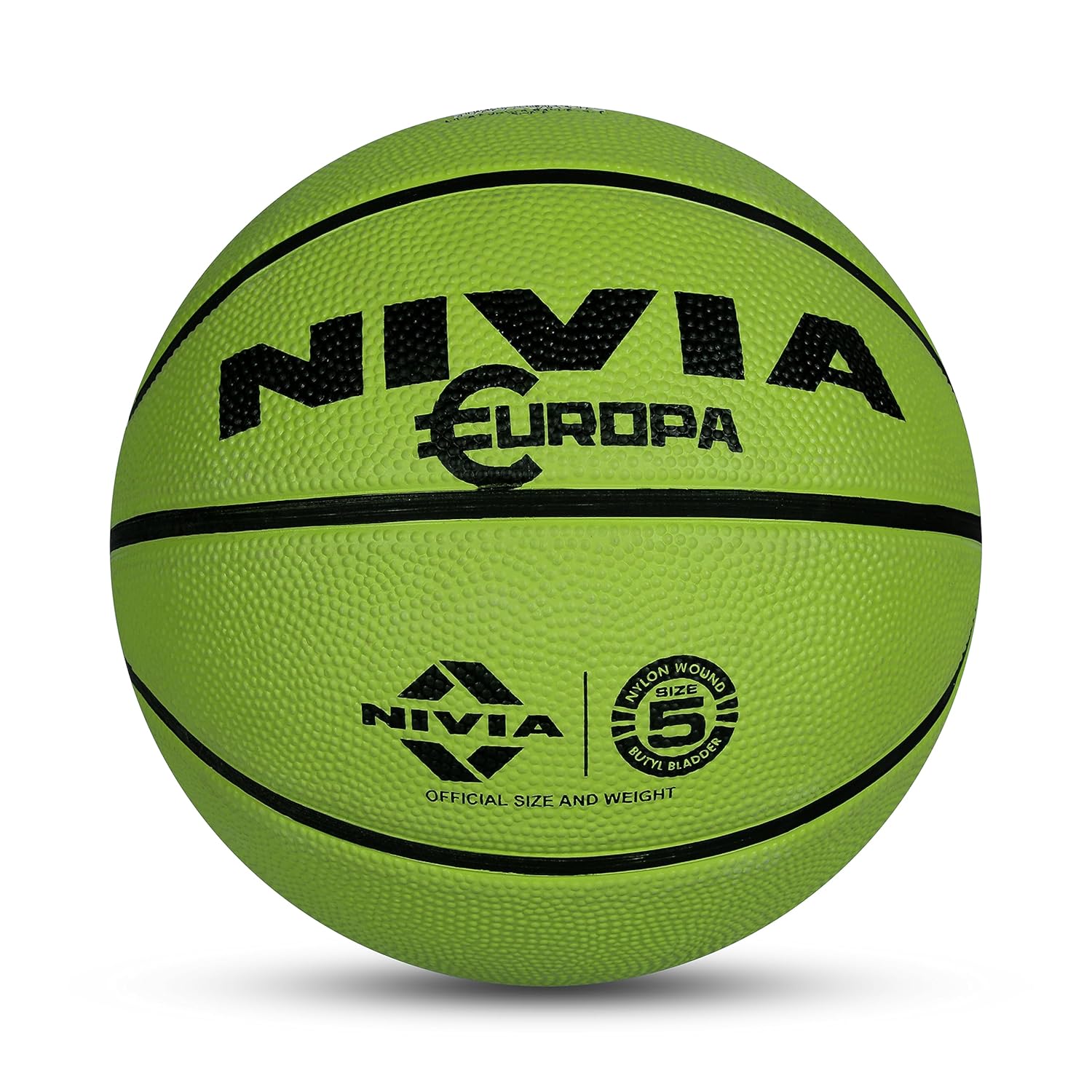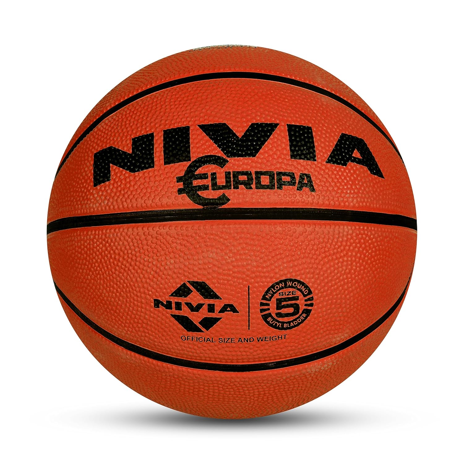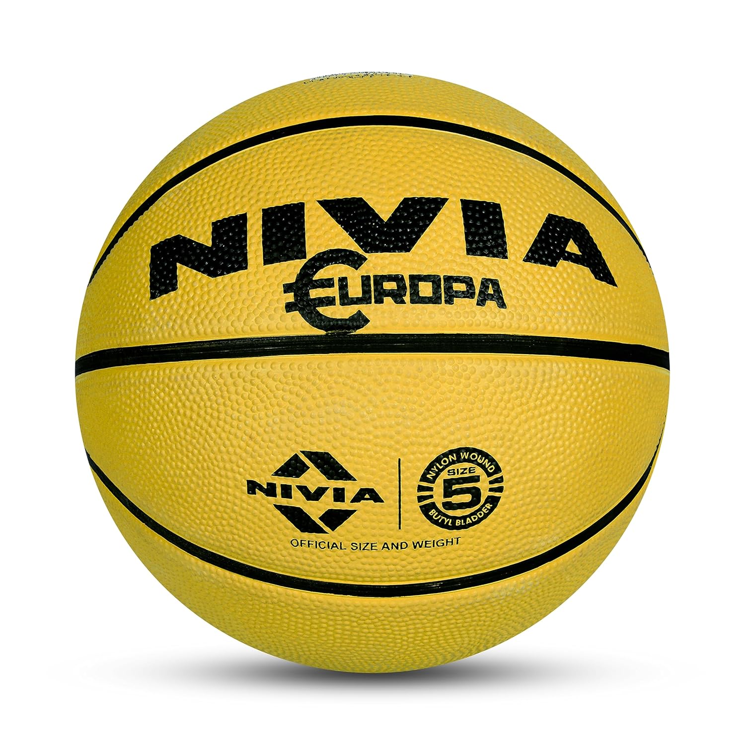 NIVIA Europa Basketball, As per Basic Standard, 8 Panels, Molded Durable Rubber Cover with Pebbled Texture, Butyl Threadwounded Bladder, to Play on All Indoor & Outdoor Surfaces (Size – 5, Assorted)