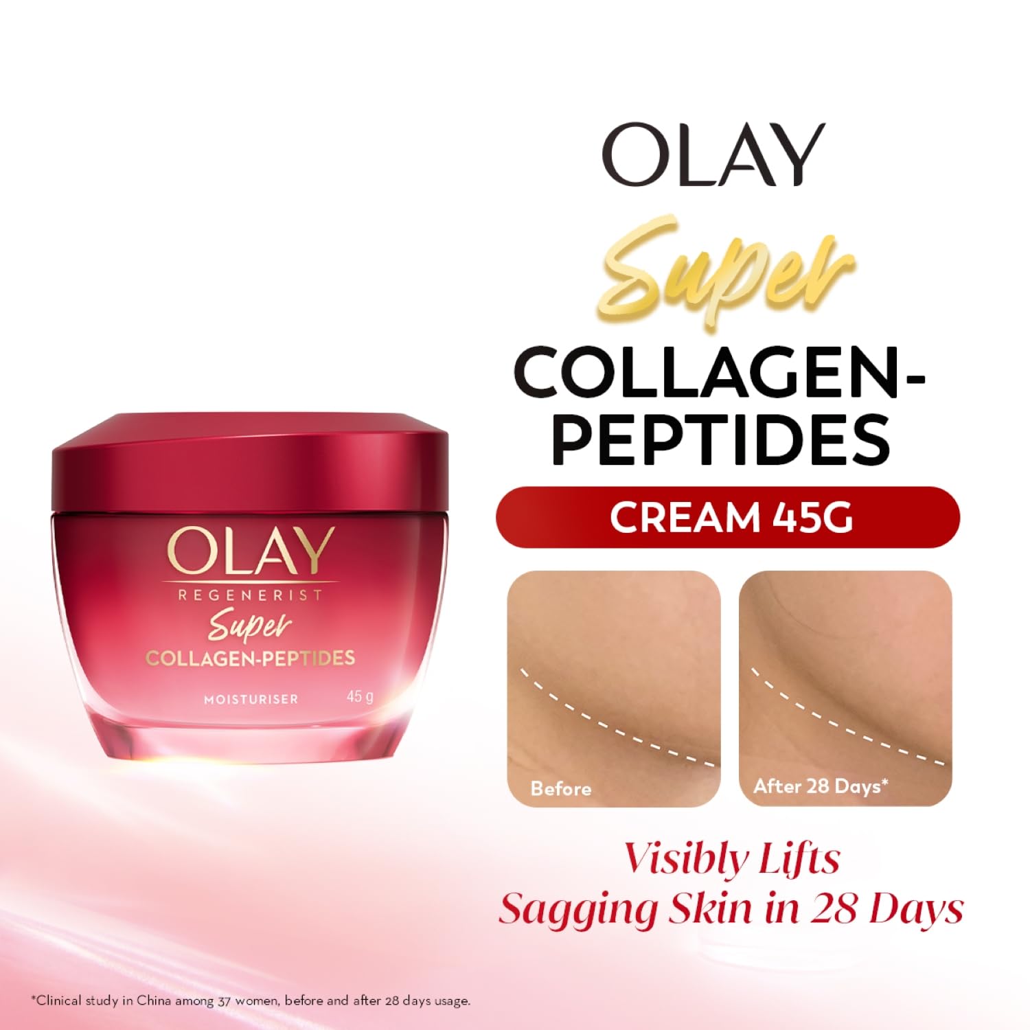 Olay Regenerist Super Collagen Peptides Moisturiser visibly reduces 5 ageing concerns in 28 days – sagging skin, deep wrinkles, smile lines, crow’s feet, uneven texture.All respondents feel their wrinkles are not noticeable*. 97% of women agree skin is plumped and feels lifted*. How to Use Take appropriate amount, smooth evenly over cleansed face and neck until fully absorbed. Use morning and night. Avoid contact with eyes. If contact occurs, rinse eyes with water.