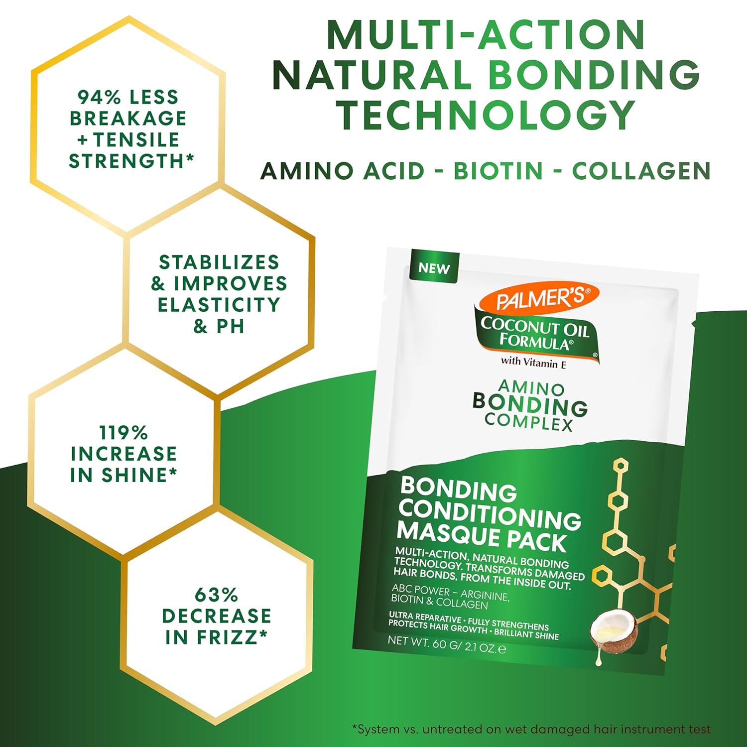 Palmer’s Hair Mask, Amino Bonding Complex Intense Conditioning Masque Pack with Coconut Oil & Vitamin E, Hydrating, Heat Protectant, Anti Frizz, Adds Shine, Protects Hair Growth, All Hair Types This highly concentrated masque is uniquely formulated with nourishing ingredients, including Coconut oil, Vitamin E and essential nutrients to deeply nourish, enhance moisture, and seal in hydration. Powered with Amino Acid (Arginine), Biotin & Collagen, the bonding hair mask maximizes tensile strength, provides lasting protection, adds brilliant shine and softness. Our heat protectant hair treatment masks shield your hair from styling damage, providing an additional layer of heat protection up to 450 degrees. This ultra-reparative hair mask helps control frizz, breakage and split ends. Whether you have curly, straight, or fine hair, this hair bonding treatment promotes growth and thickness, making it a great addition to your hair care routine. How It Works This bonding complex penetrates to the hairAs cortex, helping to support the keratin structure and reinforce damaged hair bonds. With each use, hair becomes stronger, shinier, softer, and bouncier, while minimizing further damage. Suggested Use After shampooing, coat hair from root to tip. Massage or comb through, wait 5-10 minutes, then rinse.