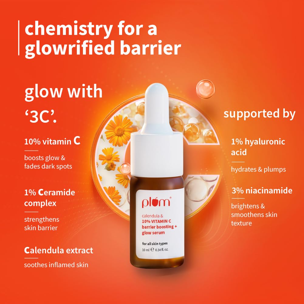 Plum 10% Vitamin C & Calendula Barrier Boosting + Glow Serum 10 ml | With 3% Niacinamide, 1% Hyaluronic acid & 1% Creamide complex| Clinically proven to reduce pigmentation & dark spots in 14 days| Boosts glow from 1st use | Men & Women | For all skin types