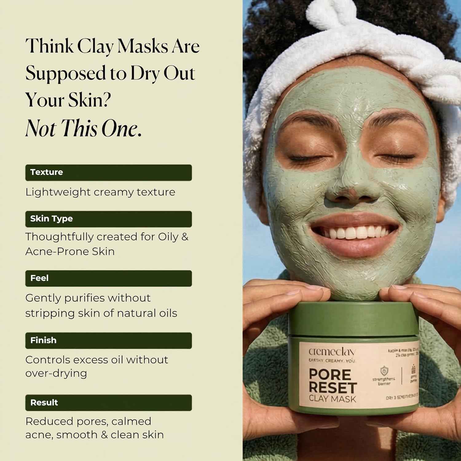 Controls Oil w/o Over-Drying: Cremeclay clay mask targets grease while protecting your moisture barrier, leaving your skin clean, refreshed, and perfectly balanced.