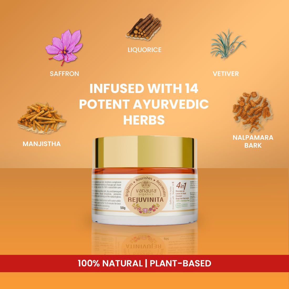 Rejuvinita is an authentic ayurvedic blend which is 100% chemical-free.It gives your skin a 360-degree treatment on all aspects. It rejuvenates skin, brightens complexion, and enhances youthful radiance.