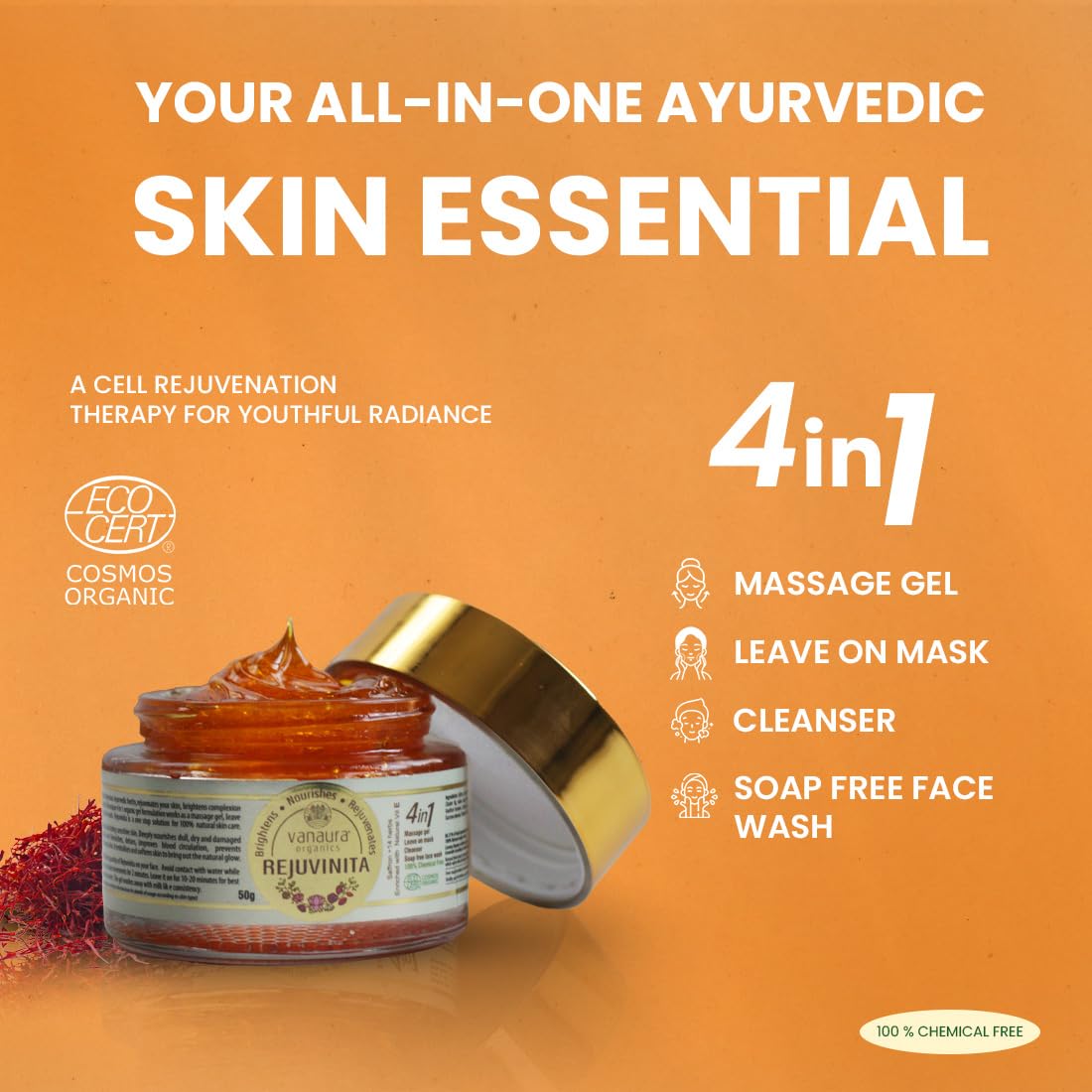 Rejuvinita is a one bottle solution that acts as a Massage Gel, Leave On Mask, Cleanser, Soap Free Wash.Improves facial blood circulation, Prevents skin sagging and De tans.