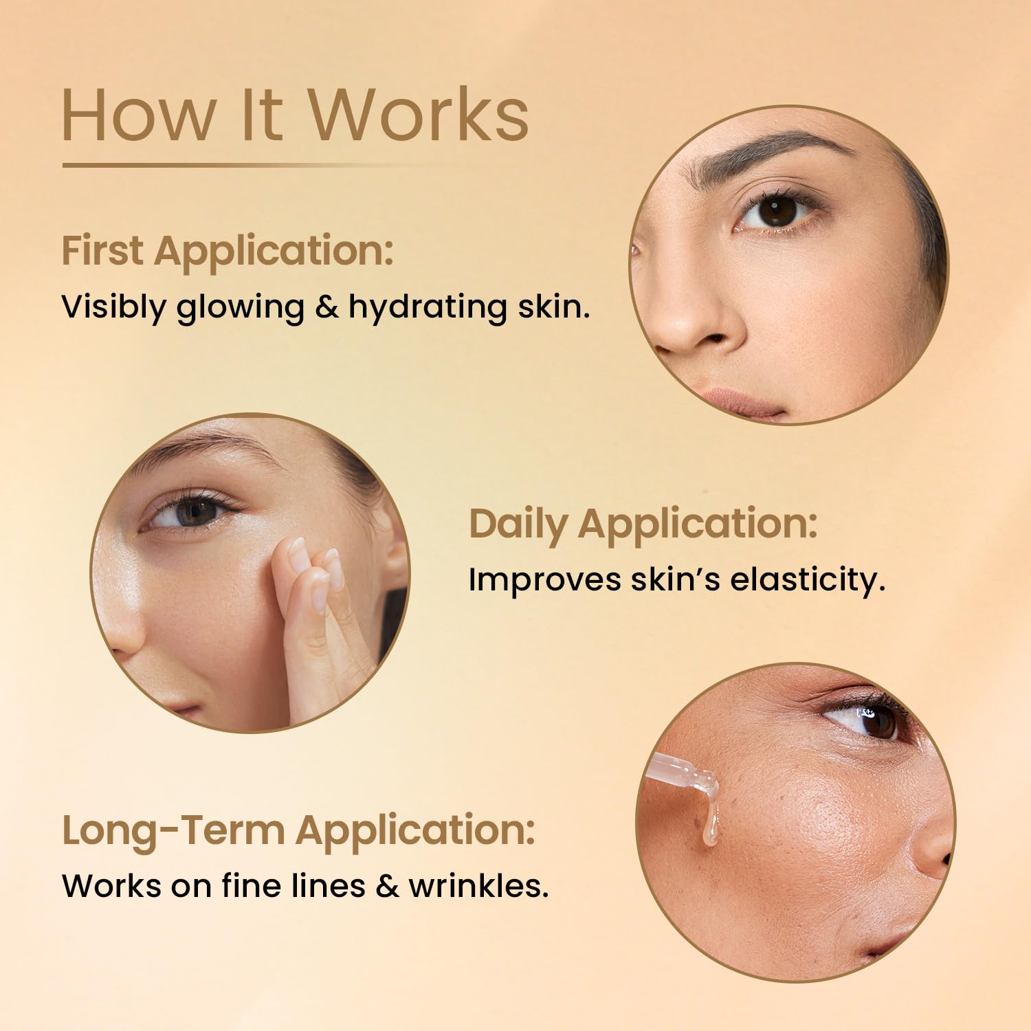 Daily Application : The elasticity of the skin improves dramatically revealing a firmer and youthful looking skin.