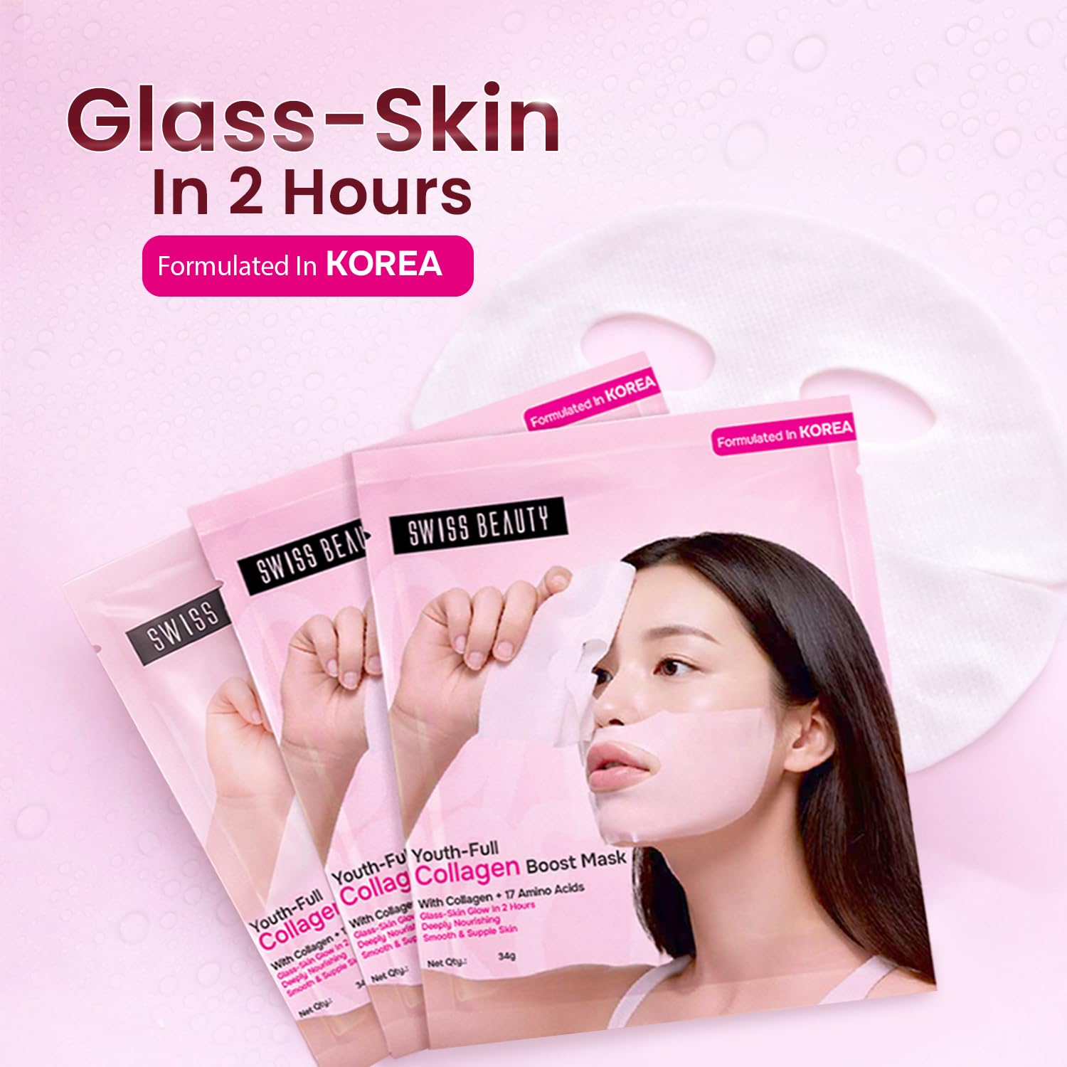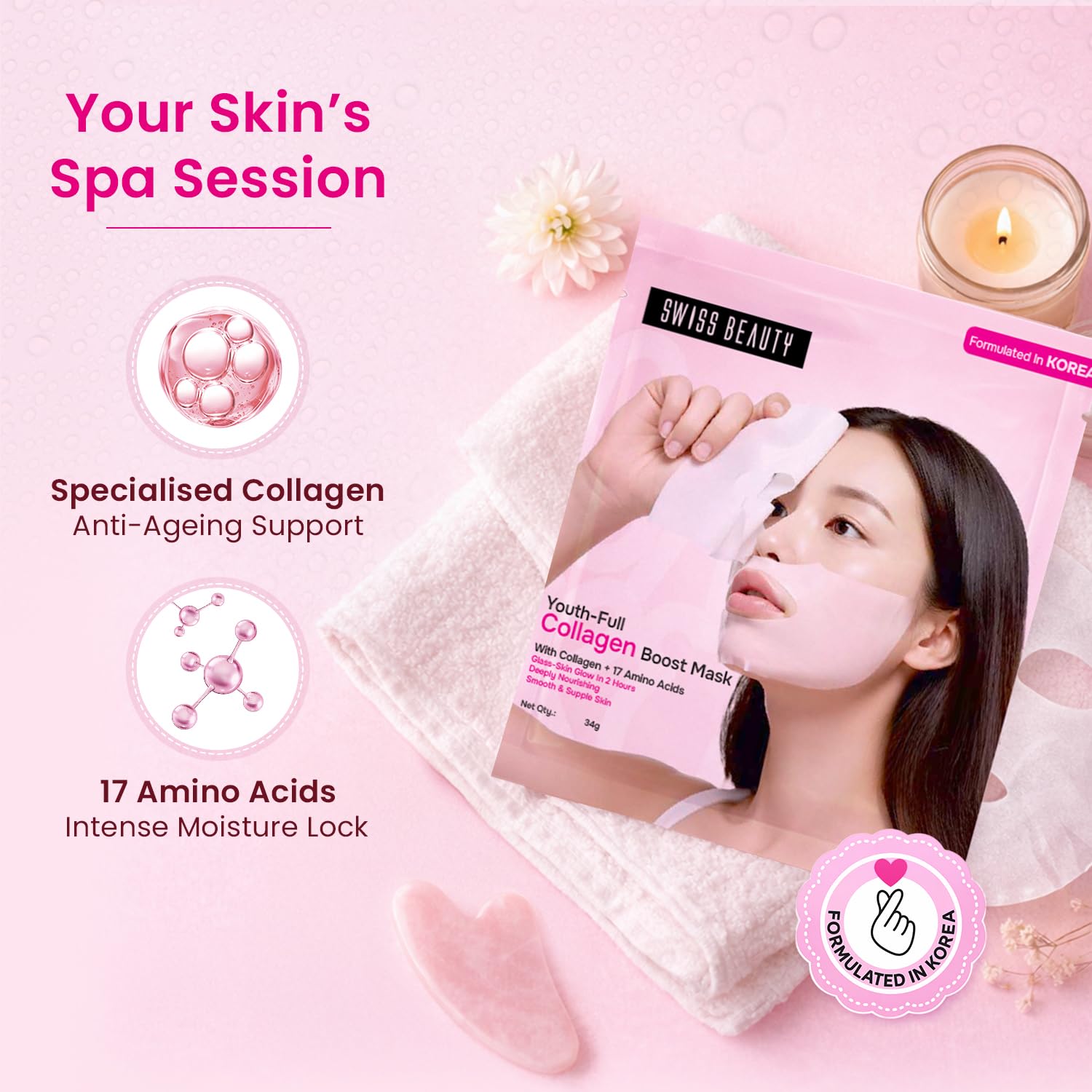 Swiss Beauty Care Youth-Full Collagen Boost Mask | Glass-Skin In 2 Hours | With Collagen & 17 Amino Acids | Plumps & Hydrates | 34g