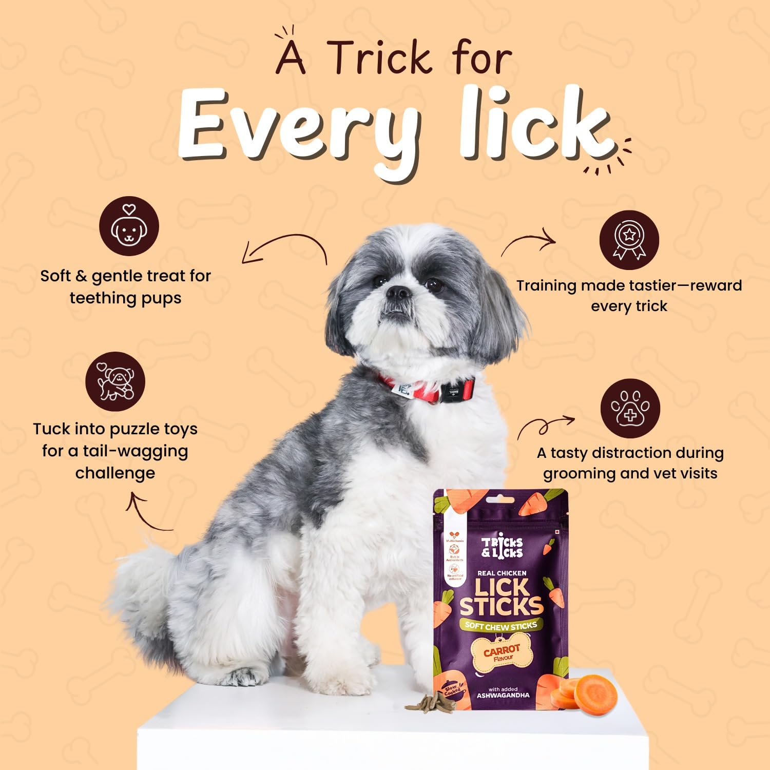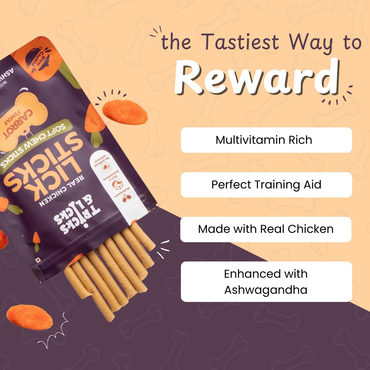 Carrot flavor soft chew sticks for dogs made with real chicken and herbs. These non veg dog treats are perfect for puppies, adult dogs, and small dog breeds like shih tzu.