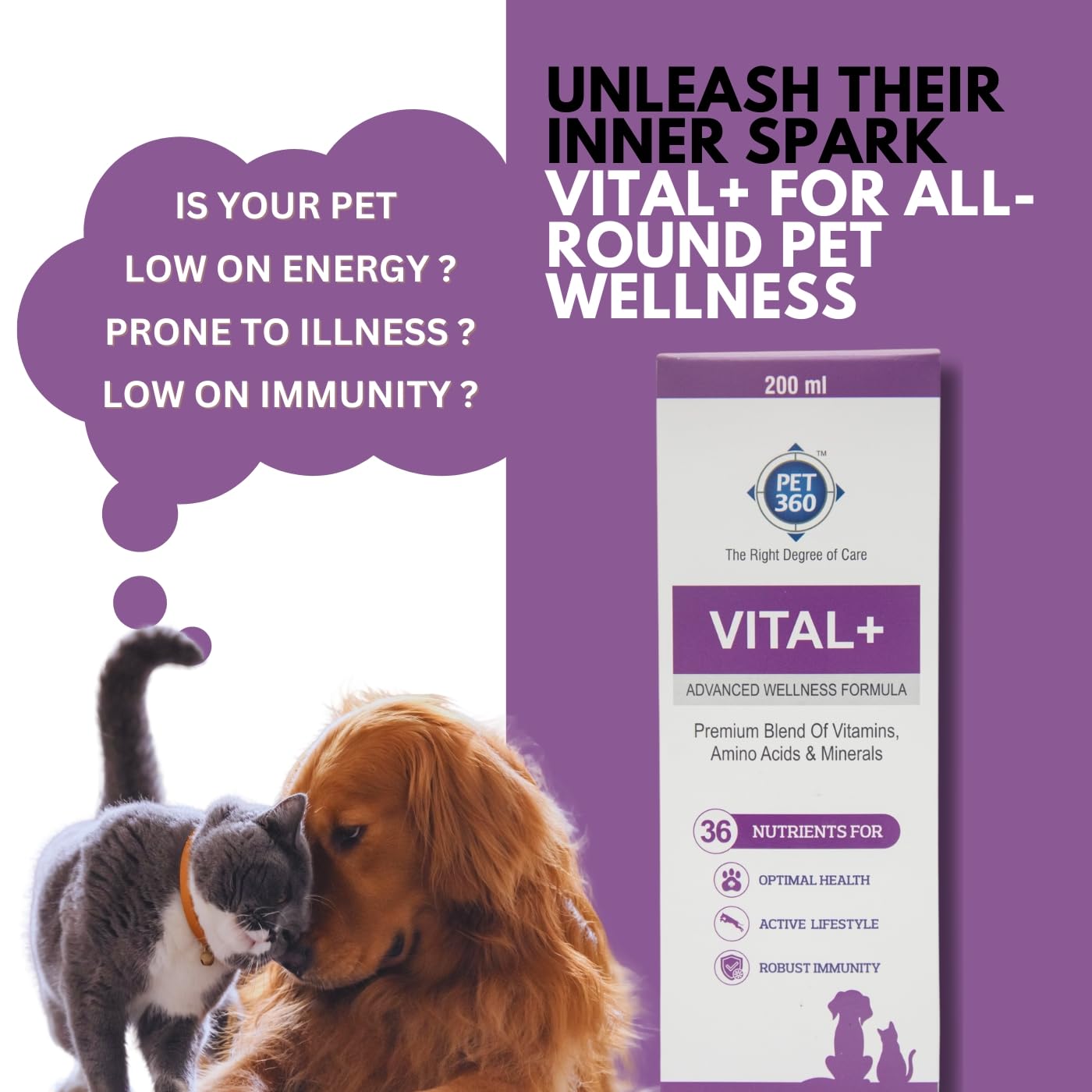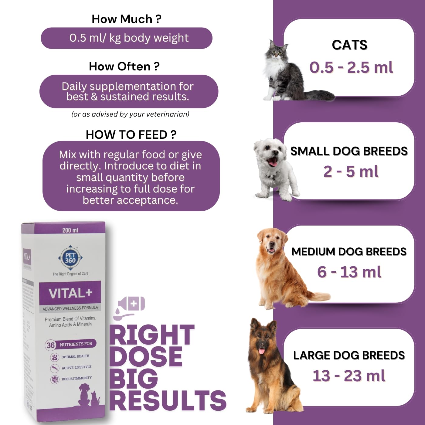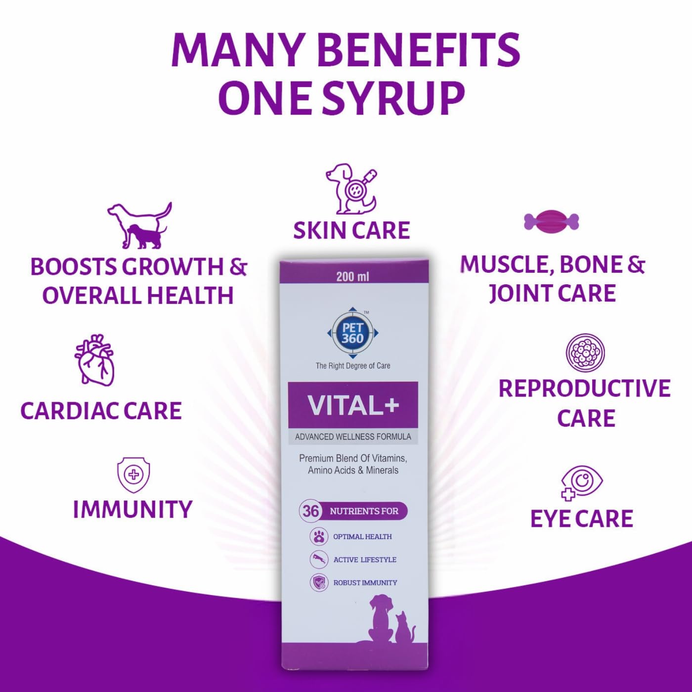ENHANCED IMMUNITY & GROWTH: VITAL+ Advanced Wellness Formula by PET360 delivers 36 essential nutrients in a form of syrup, including multivitamins, amino acids, minerals, and antioxidants. Ideal for all breeds, this pet nutritional supplement supports overall health, growth, and immunty.