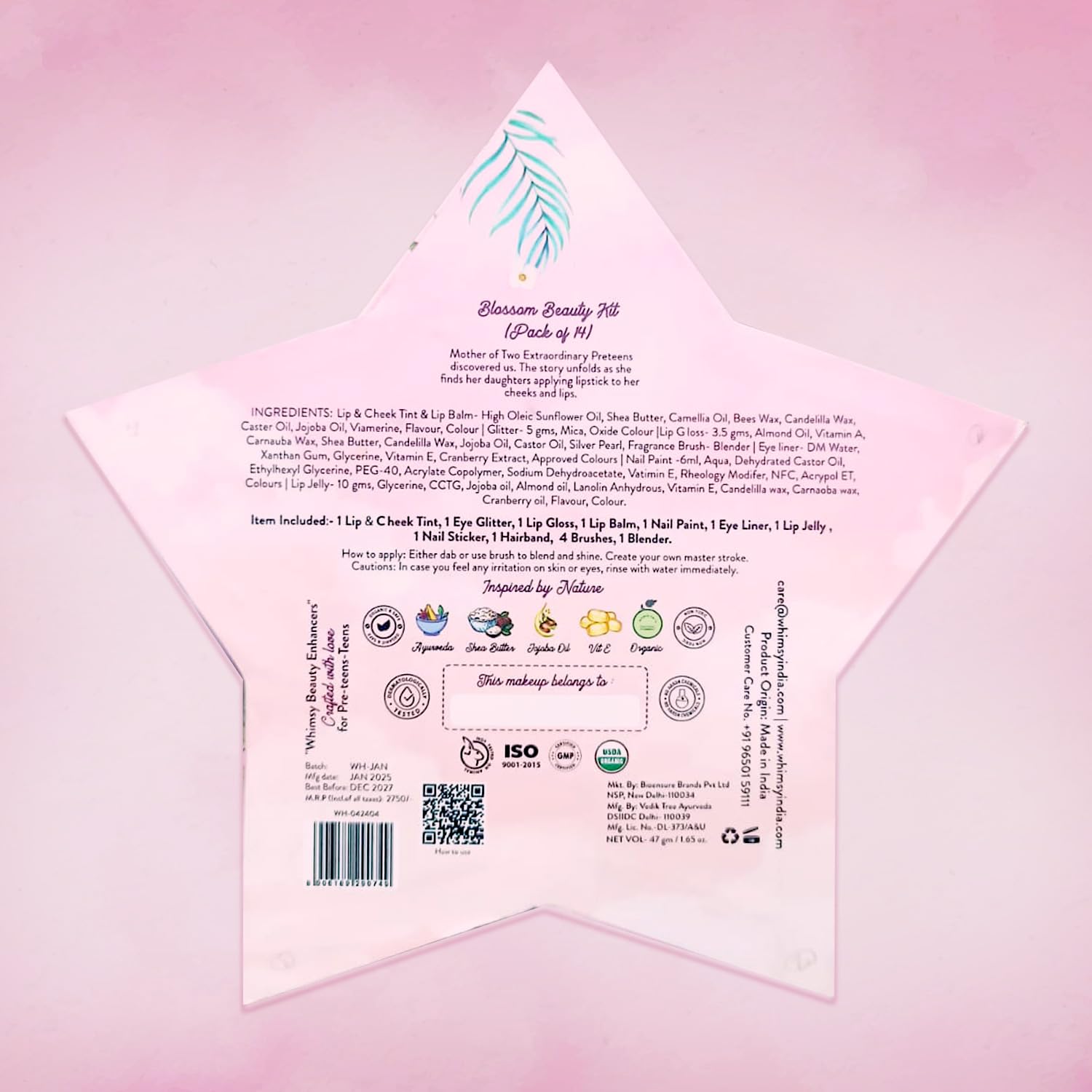 Whimsy Beauty Organic & Safe Blossom Makeup Kit| Safe, Non-Toxic Beauty Set for Girls & Teens |Eye Glitter, Lip Cheek Tint, Lip Gloss,Eye Liner, Nail Paint and Mermaid Brushes (Pack of 14)